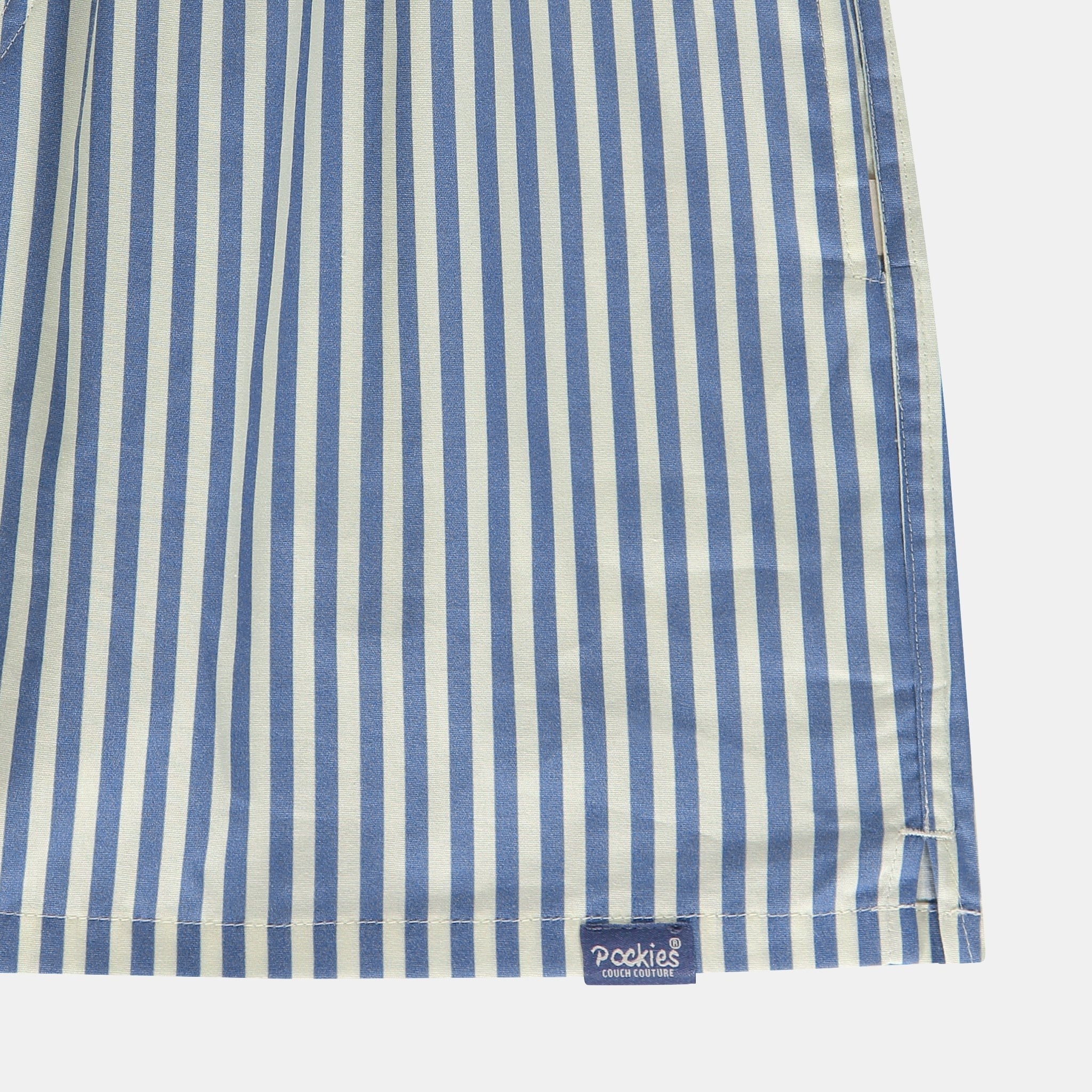 Een blauw wit gestreepte boxershort gemaakt van 100% organisch katoen en ontworpen met een comfortabele pasvorm. De boxershort valt op door zijn functionaliteit, aangezien het twee steekzakken heeft.