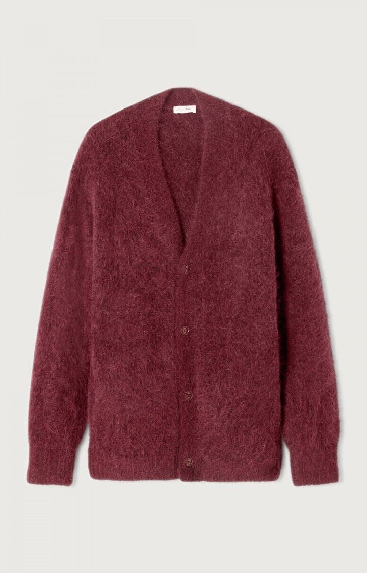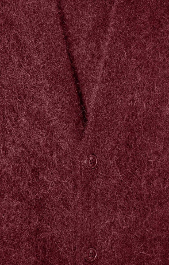 Een donkerrood fluffy vest met lange mouwen en een V-hals. Het vest is gemaakt van een zachte mix van alpaca- en acrylvezels.
