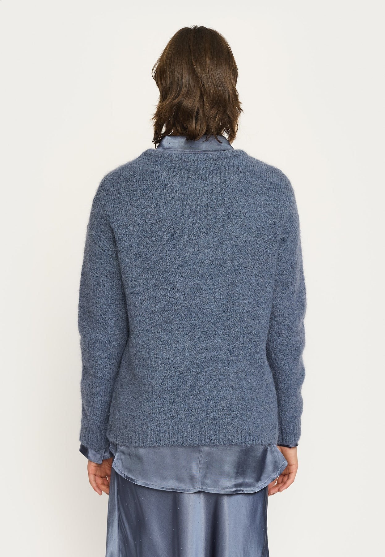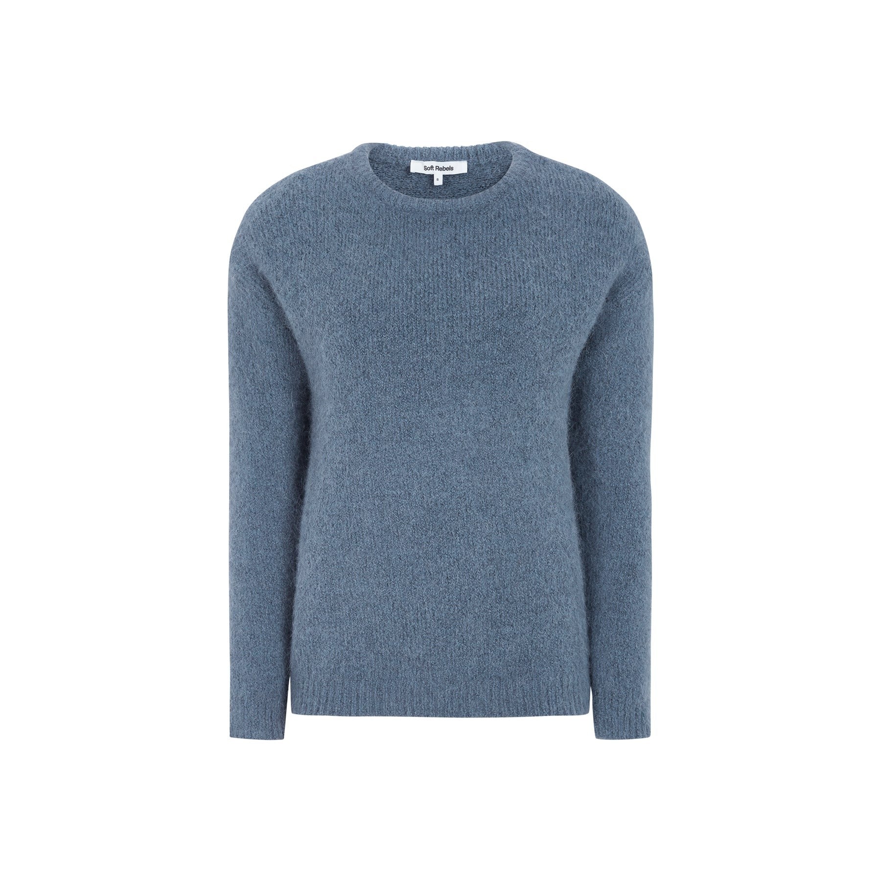 Deze blauwe knit biedt knusse elegantie en is ontworpen voor warmte en comfort tijdens de herfst. Het gebreide item is gemaakt van een zachte, luxe mix van alpaca, nylon, acryl en spandex. De veelzijdige trui is perfect om te layeren of om op zichzelf te dragen.