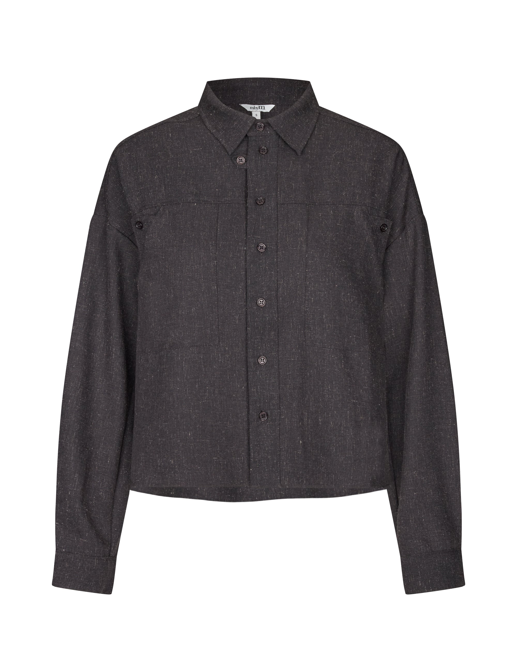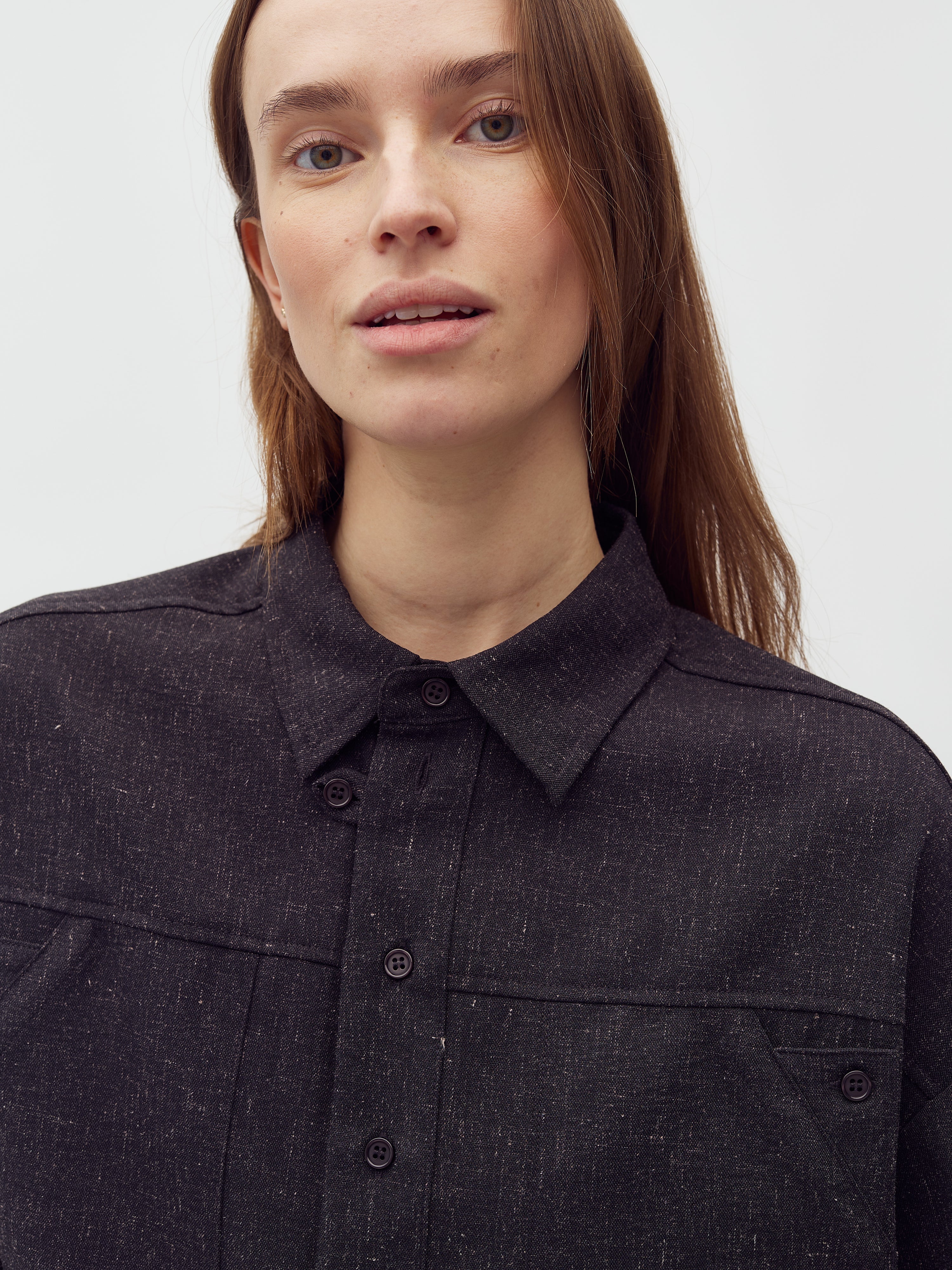 Een donkerblauw, gedetailleerd, losvallend overhemd met een overhemdkraag. De blouse is kort van lengte en heeft knopen aan de voorkant. De stof is voorzien van een ingeweven print en details aan de voorzijde.