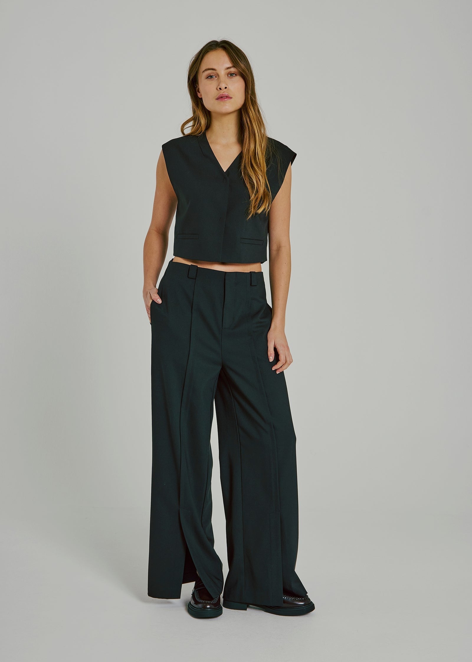 De pants in het zwart is een getailleerde, maar relaxte broek met een wide-leg silhouet en scherpe plooien. Deze broek, ontworpen voor een gepolijste afwerking en moeiteloze beweging, combineert perfect met cropped tops of blazers voor een moderne, verfijnde outfit.