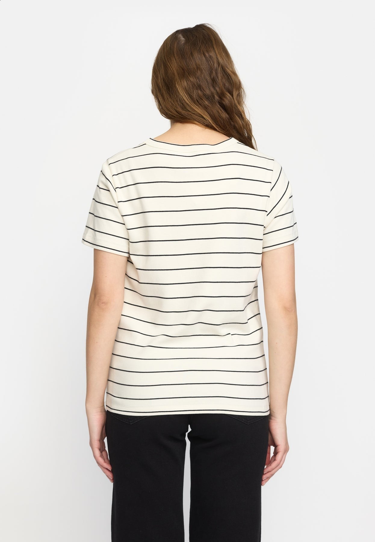 Een zwart witte, eenvoudige en tijdloze basic. Dit T-shirt heeft horizontale strepen en een klassieke ronde hals. Gemaakt van 100% biologisch katoen, biedt dit casual T-shirt een comfortabele en stijlvolle optie voor een relaxte look, perfect te combineren met een jeans of shorts.
