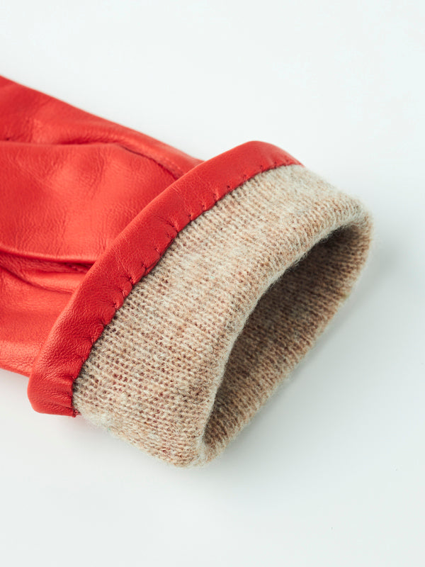 Een elegante handschoen in zacht lamsnappa leer, uitgevoerd in de warme flame red (oranje/rood). Deze klassieker van Viska combineert premium materialen met subtiele details en een tijdloze uitstraling.