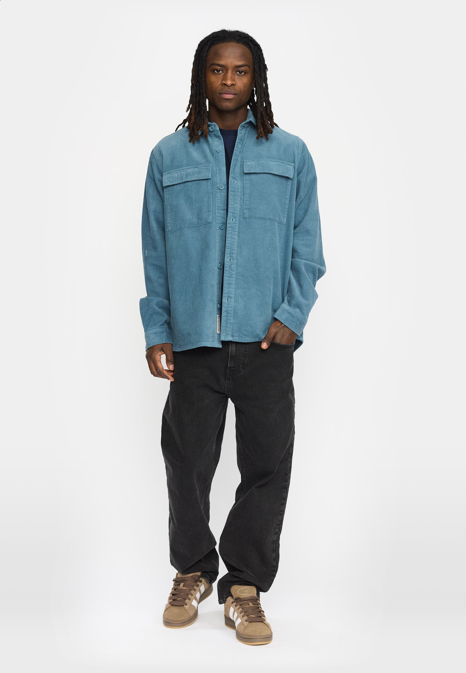 Een blauw, robuust overshirt gemaakt van een zware '8-wales' biologische katoenen corduroy stof, wat zorgt voor een zacht en fluweelachtig oppervlak. Dit functionele shirt is voorzien van karakteristieke vierkante utility-borstzakken, een knoopsluiting met ton-sur-ton knopen en verstelbare manchetten. Voor extra bewegingsvrijheid en comfort is de achterkant ontworpen met een traditionele dubbellaagse schouderpas en een platte plooi. Draag het als een warm overhemd tijdens de koude maanden of als casual laagje over een T-shirt of sweatshirt.