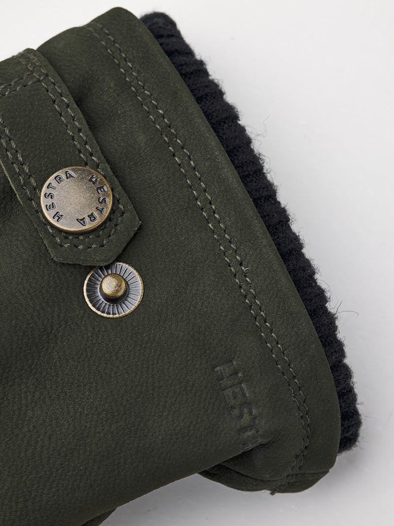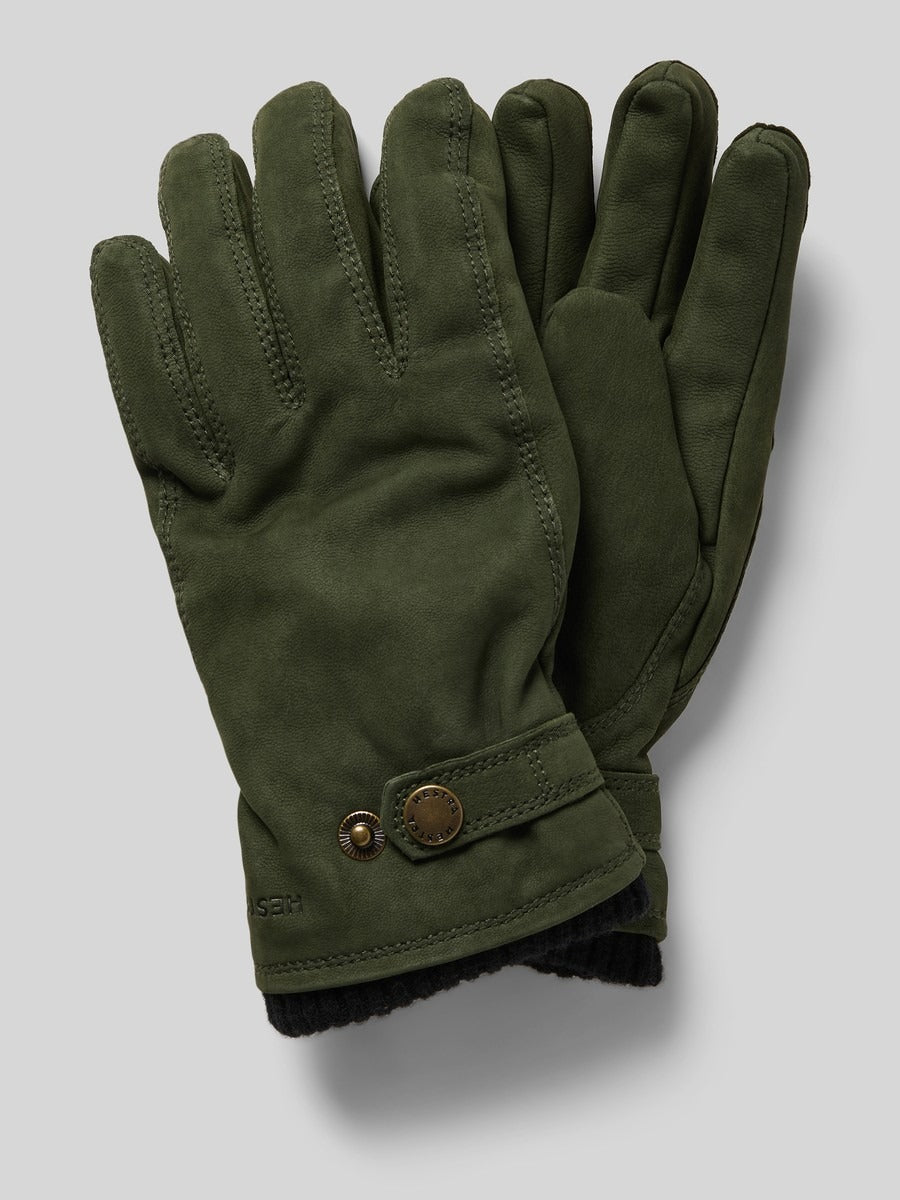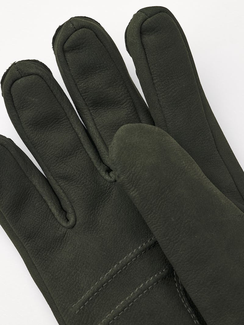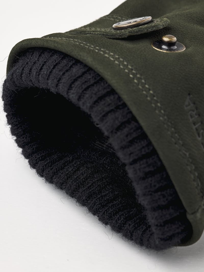 Een groene, klassieke en warme herenwinterhandschoen, gemaakt van nubuck geitenleer. De handschoen heeft een stijlvolle, minimalistische uitstraling met een korte, geribde manchet van wol en een leren band met drukknoop op de rug van de hand. De voering van zacht polyesterfleece met Primaloft Gold synthetische isolatie zorgt voor comfortabele warmte op koude winterdagen.