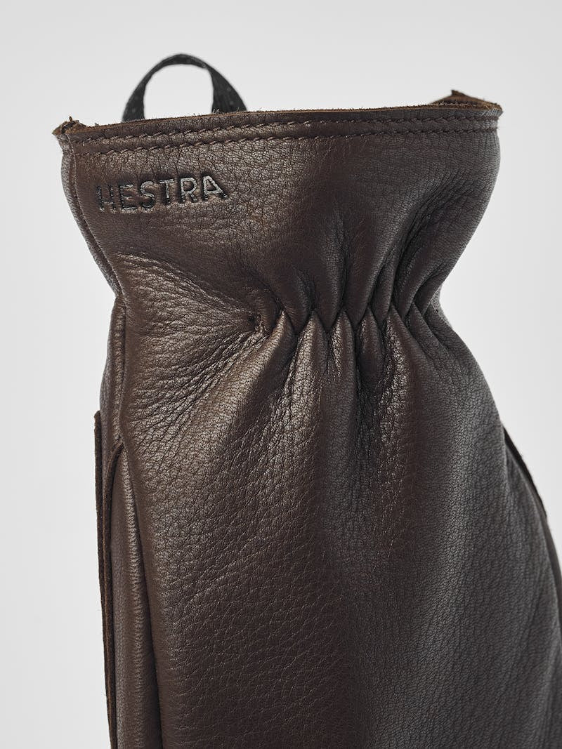 Een donkerbruine, flexibele, comfortabele herenleren handschoen, gemaakt van hertenleer. Dit leer is zacht en isolerend, met een rustieke feel. De handschoen is perfect voor koude herfst- en winterdagen en heeft een klassieke, robuuste stijl die geschikt is voor zowel dagelijks gebruik als recreatie.