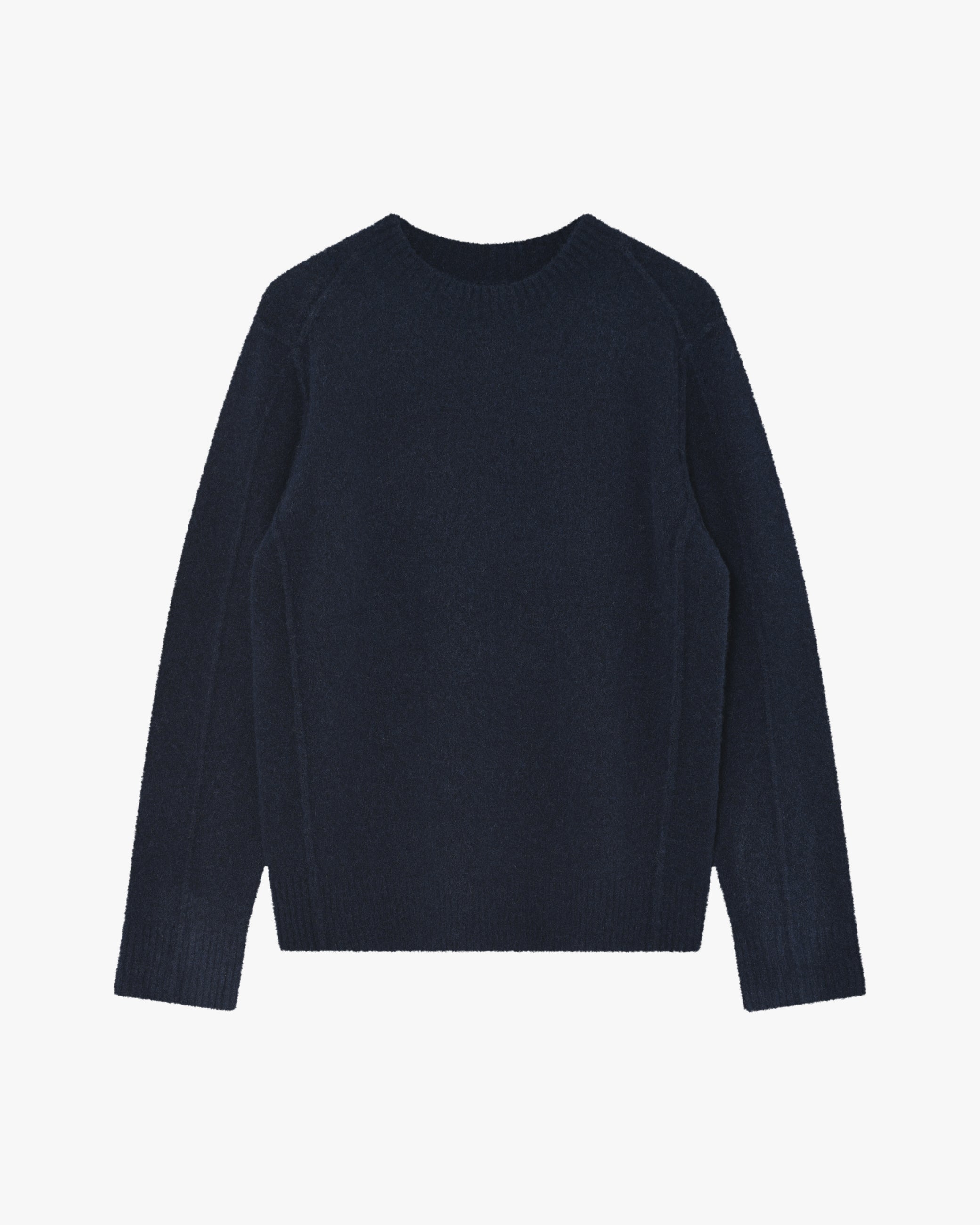 De donkerblauwe trui is gemaakt van een zachte mix van wol en alpaca, wat zorgt voor moeiteloze warmte en comfort. Met zijn strakke lijnen en ontspannen pasvorm heeft dit kledingstuk een rustige maar krachtige uitstraling — een trui die perfect past in je seizoensgarderobe.