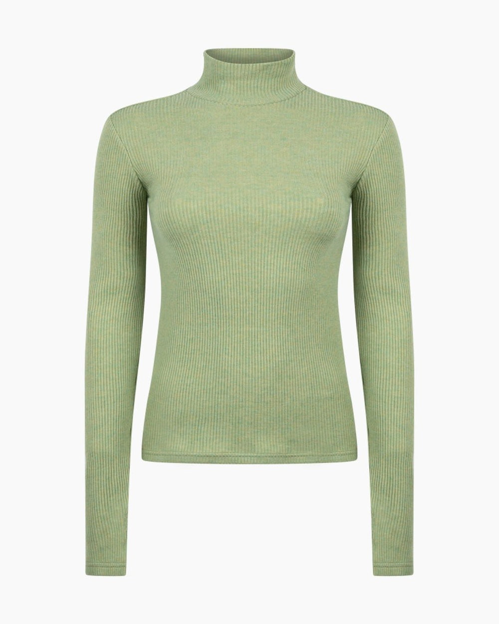 Een groene strakke basic voor elke garderobe. Gemaakt van een zachte, gemêleerde geribbelde jersey, heeft deze top een klassieke col en een nauwsluitende pasvorm die het lichaam comfortabel omsluit. Het is perfect om in laagjes te dragen of om op zichzelf te dragen — eenvoudig, stijlvol en eindeloos veelzijdig.