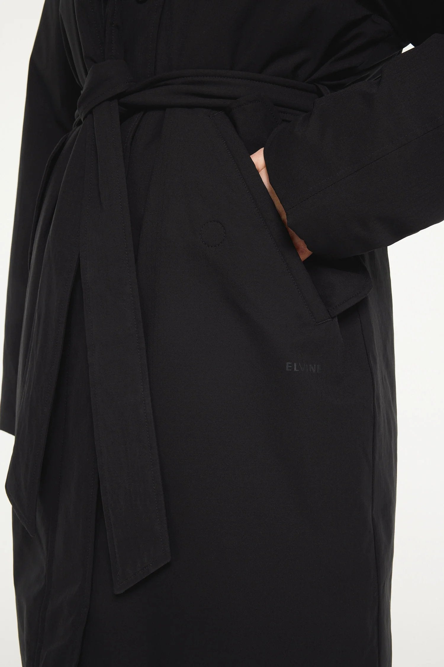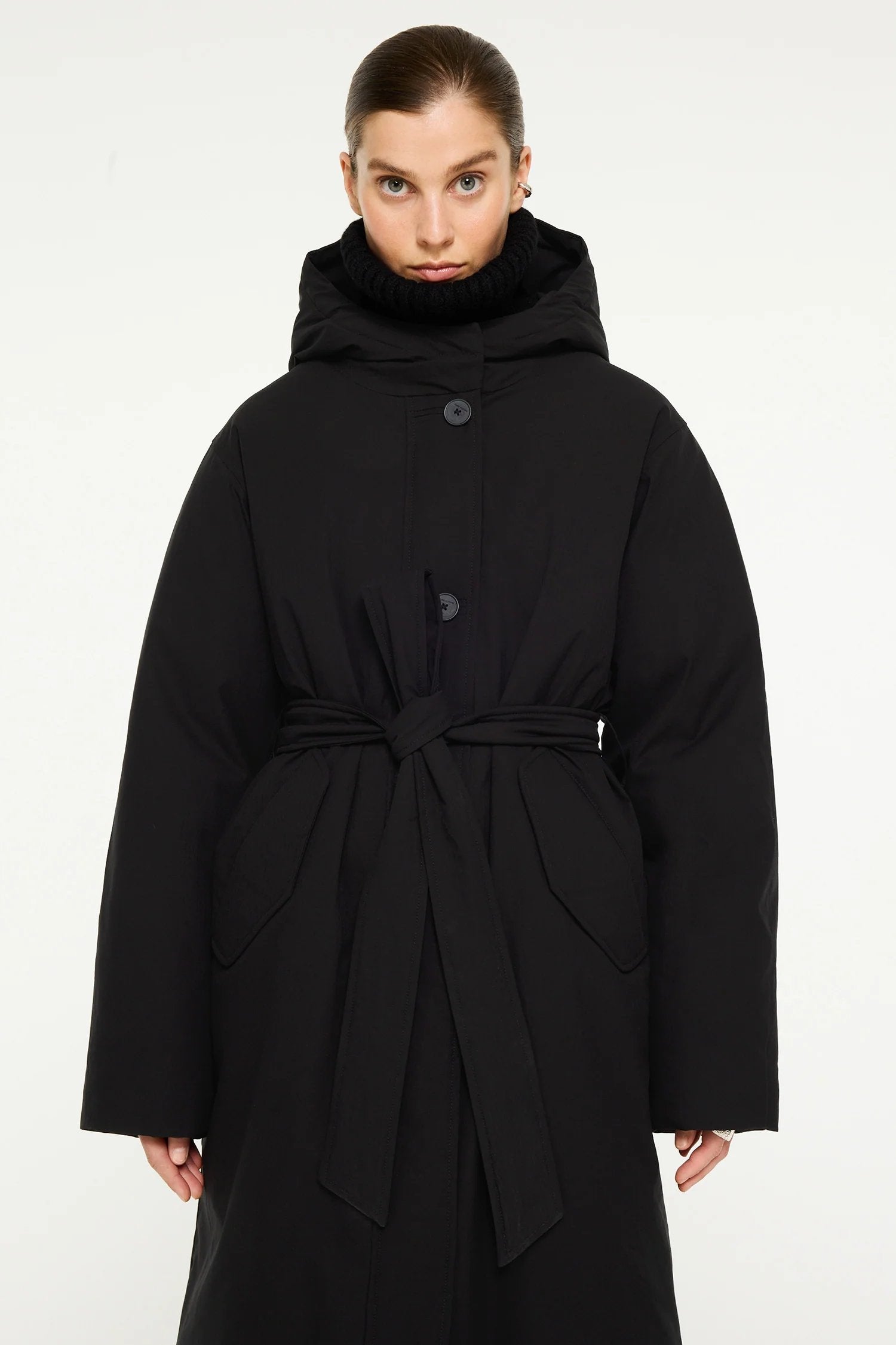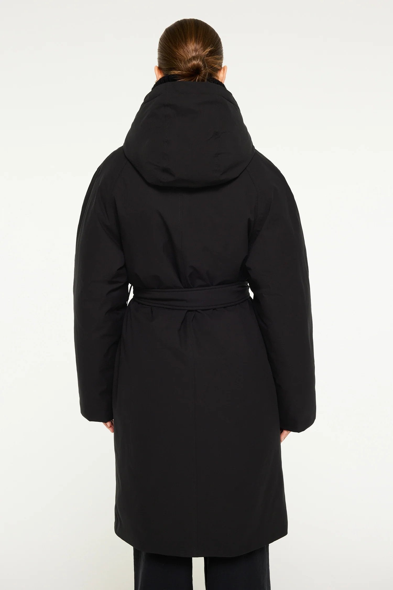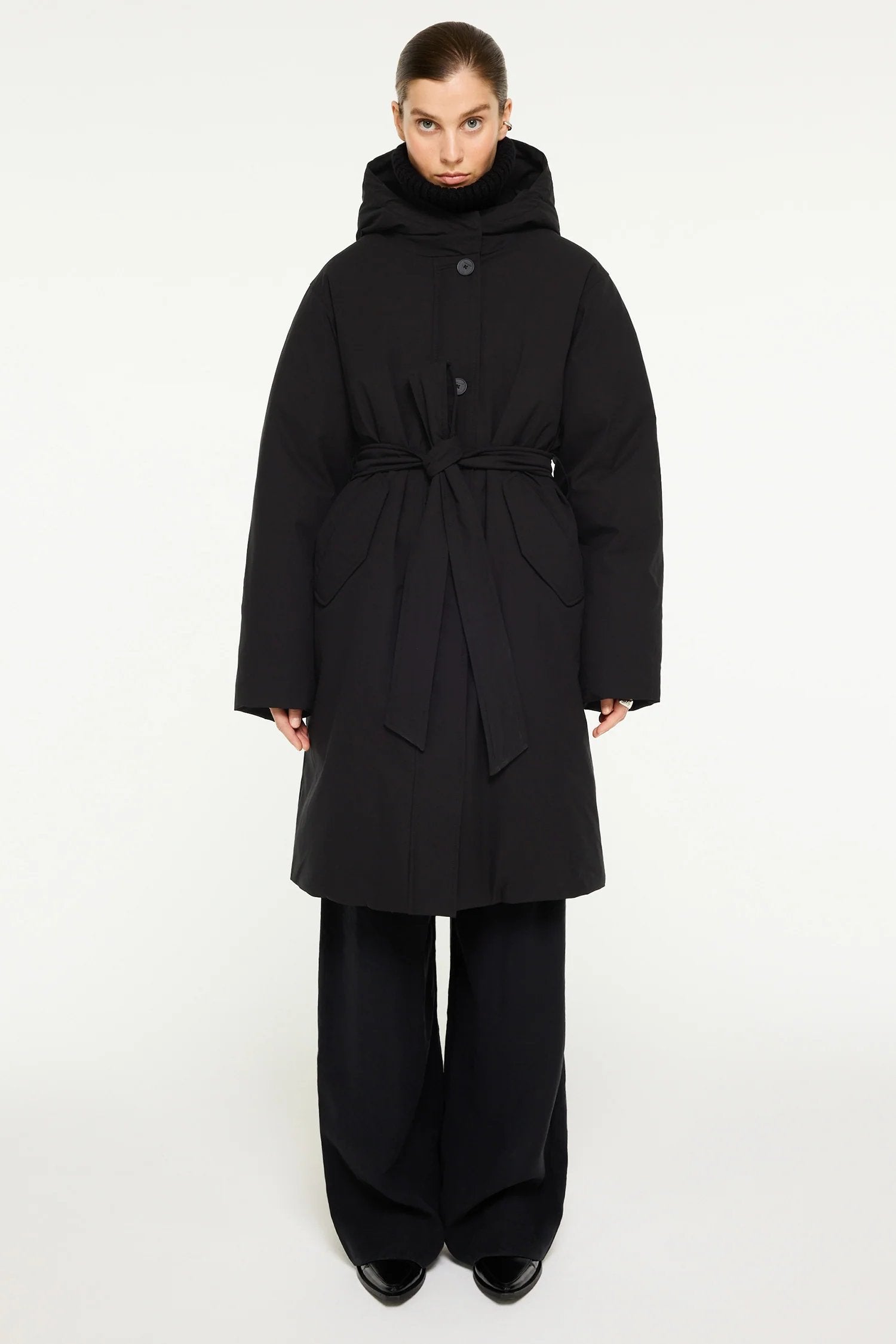 Een zwarte warme jas die elementen van zowel een parka als een jas combineert. Details zoals de tailleriem en de ripstop-stof combineren stijl en functie. De jas is ontworpen om je warm te houden in winterse omstandigheden.
