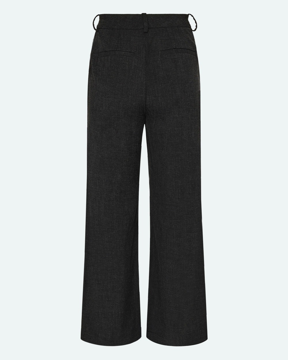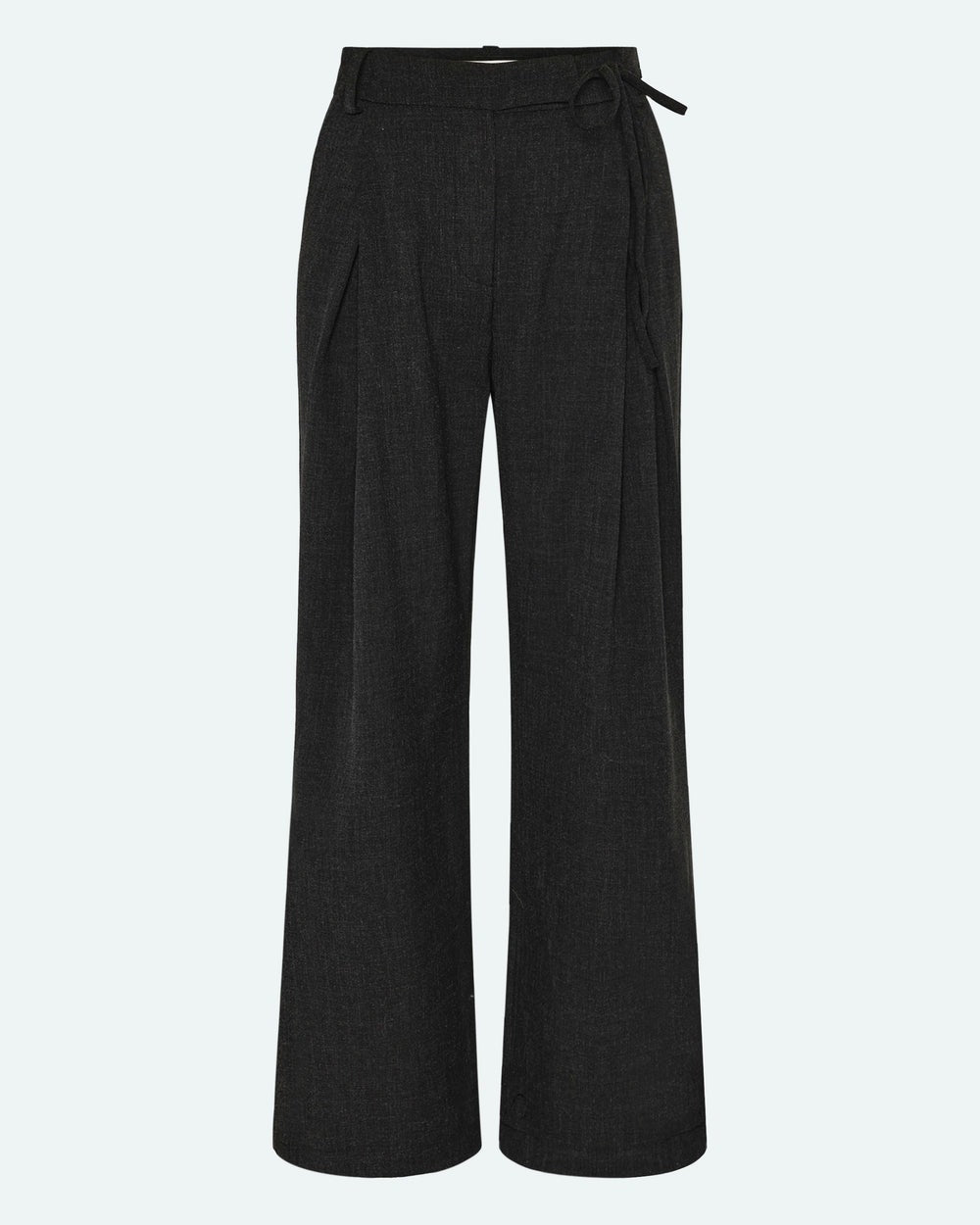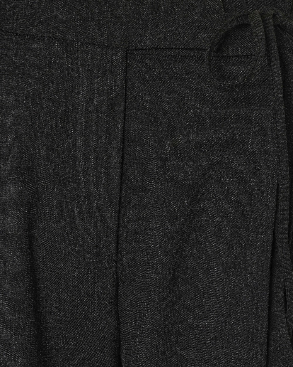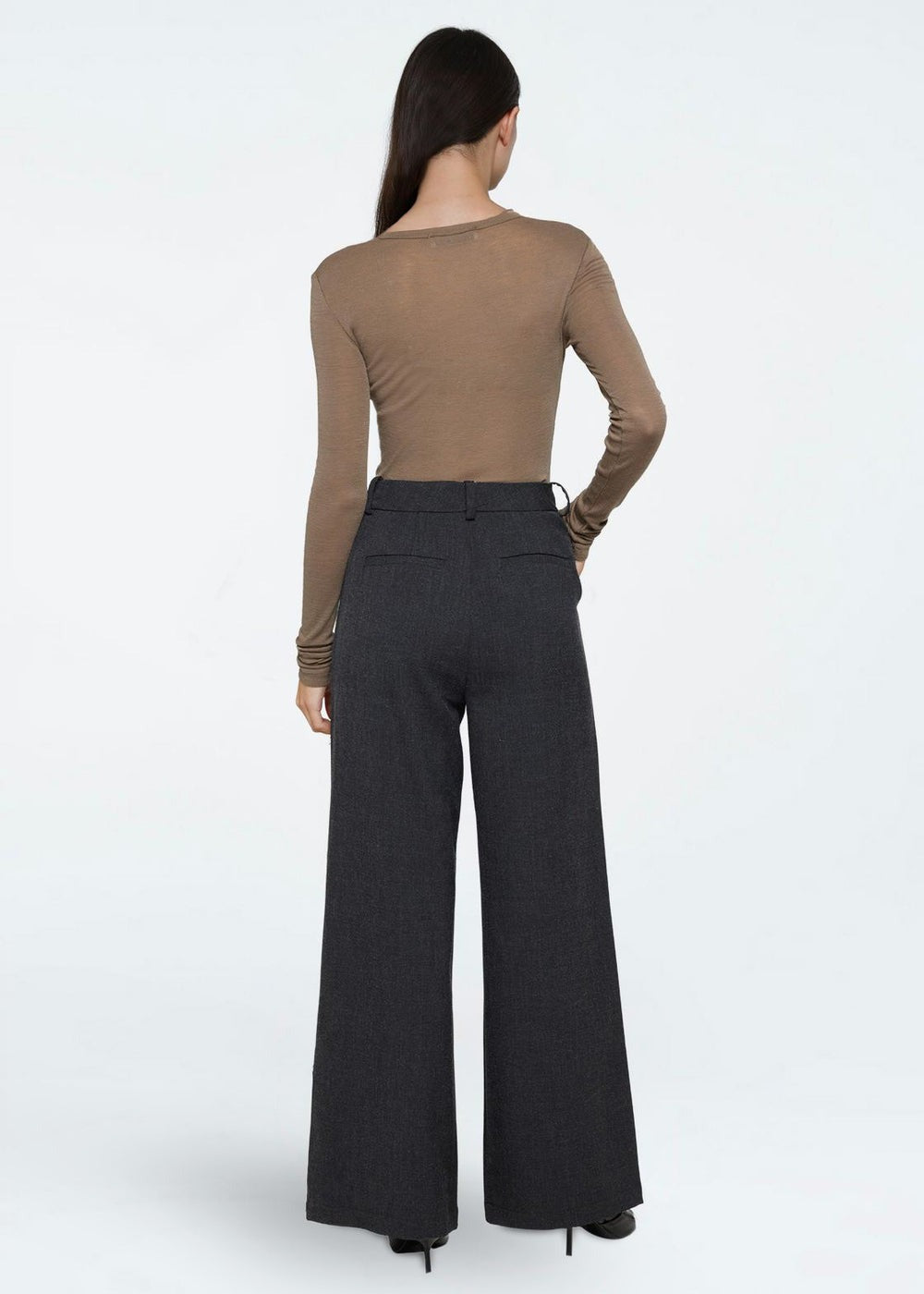 Een donkergrijze wijdvallende pantalon met een hoge taille en een losse loose fit. De broek heeft open plooien aan de voorkant, banddetails om te strikken, twee steekzakken aan de zijkant en twee paspelzakken aan de achterkant.