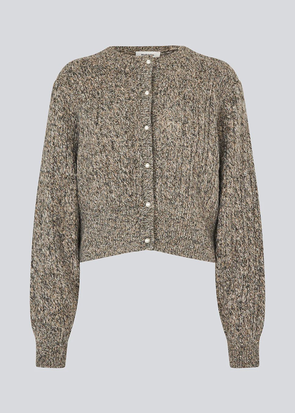 Een bruin, gebreid vest met kabelpatroon en parelknoopjes. Het vest heeft een ronde halslijn en een geribbelde zoom. Het is gemaakt van een mix van acryl, polyester, wol en alpaca, wat zorgt voor een zachte en warme feel.