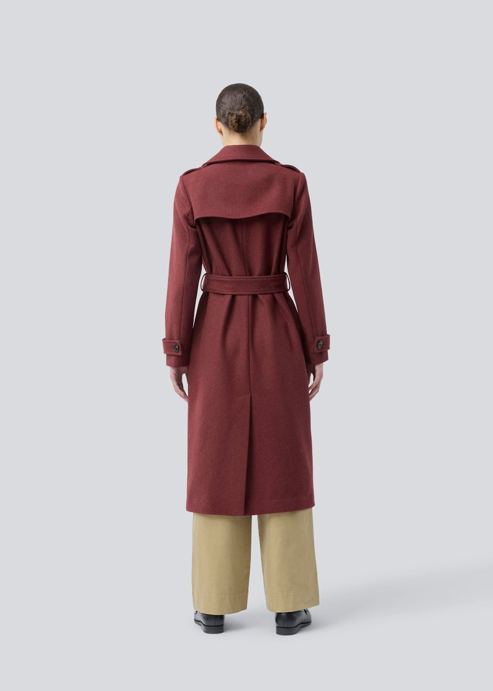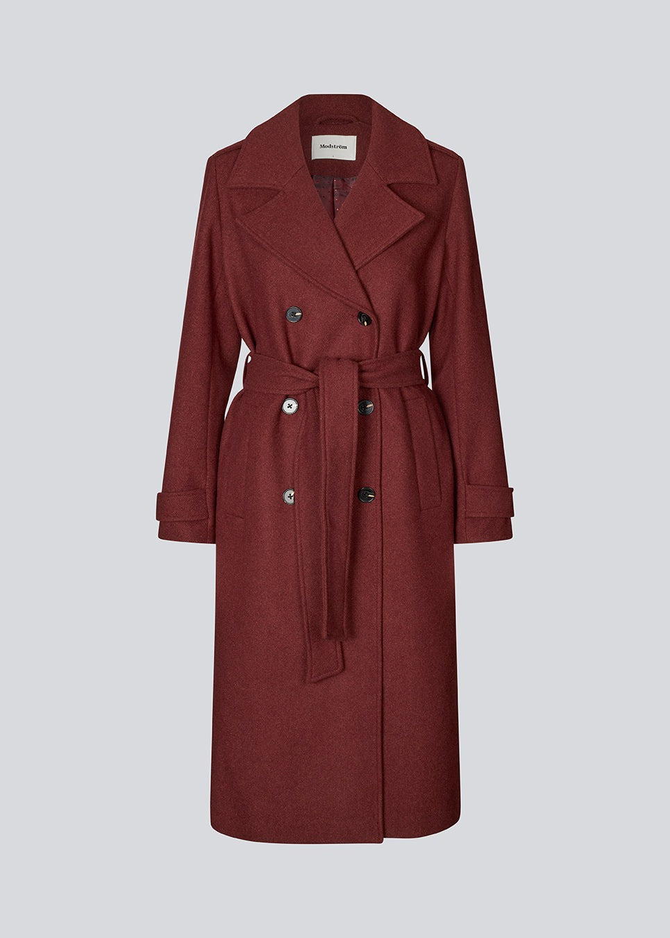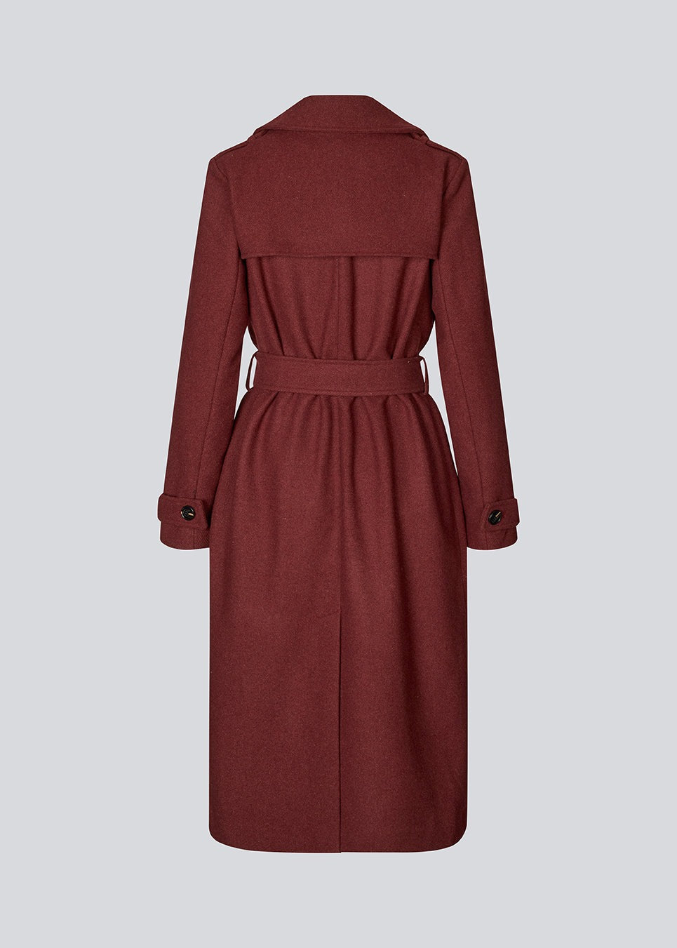 Een donkerrode, klassieke, dubbelrijige wollen jas. De jas heeft een kraag met notch lapels (revers) en een brede strikceintuur in de taille. Details zoals schouderbanden, brede manchetten en een open rugpas maken het ontwerp compleet. De jas is gevoerd en heeft een enkele split aan de achterkant.