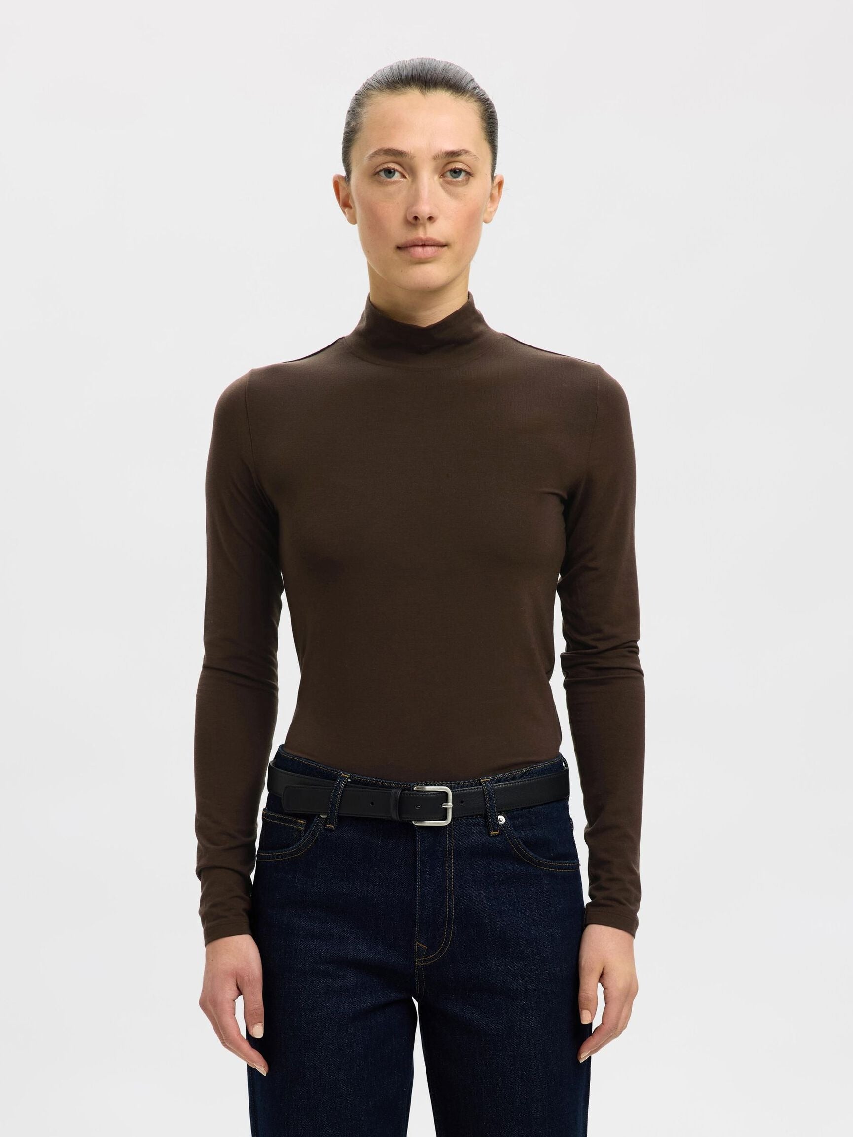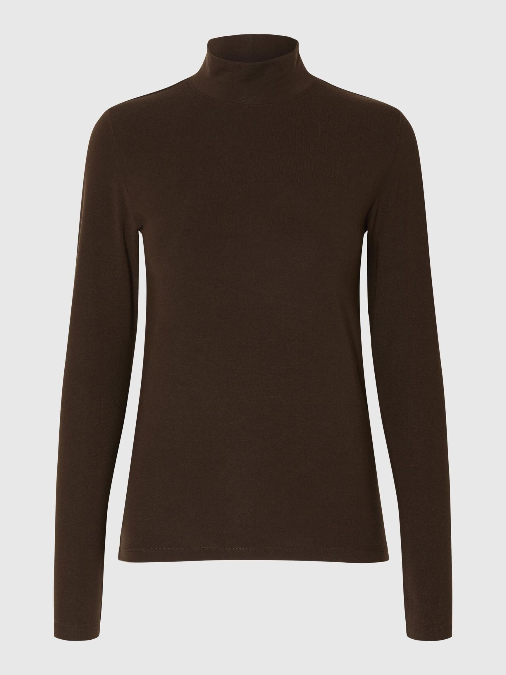 Een bruine comfortabele basic die je garderobe aanvult. De longsleeve is gemaakt van een comfortabel, flexibel en stretchy materiaal, wat zorgt voor een slim fit pasvorm. De top heeft een hoge kraag en is eenvoudig te combineren, bijvoorbeeld met een high-waist jeans en een geruite blazer.