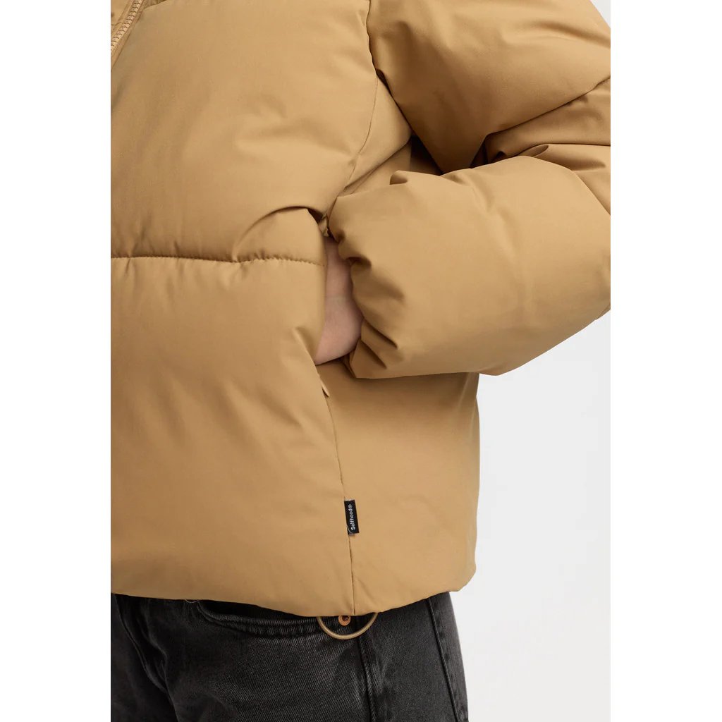 Een beige pufferjack in een subtiel kort ontwerp. Het is gemaakt van een dunne, rekbare stof van gerecycled polyester. De jas heeft een opvallende ton-sur-ton Vislon-rits, een opstaande kraag en een verstelbare zoom aan de onderkant. De zijzakken met verborgen ritsen zijn gevoerd met warme fleece voor extra comfort.