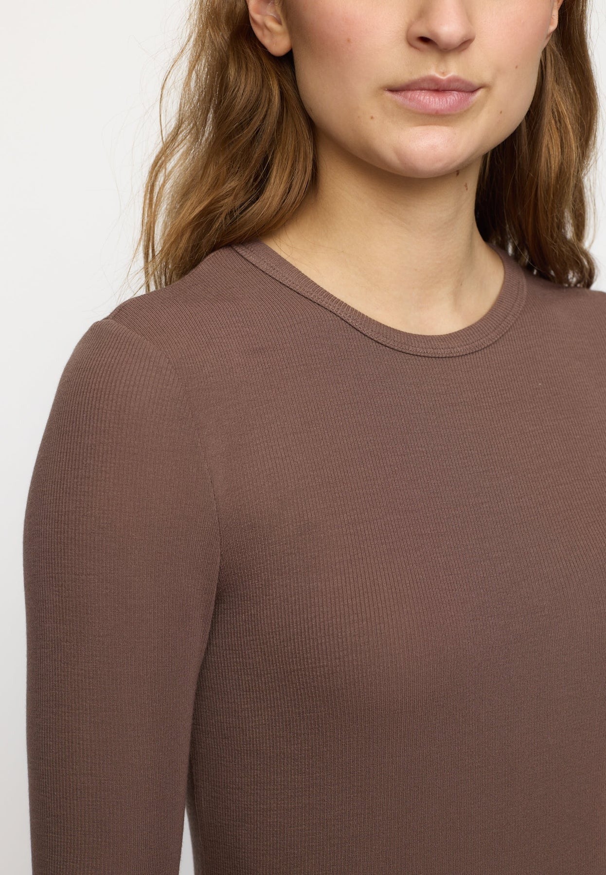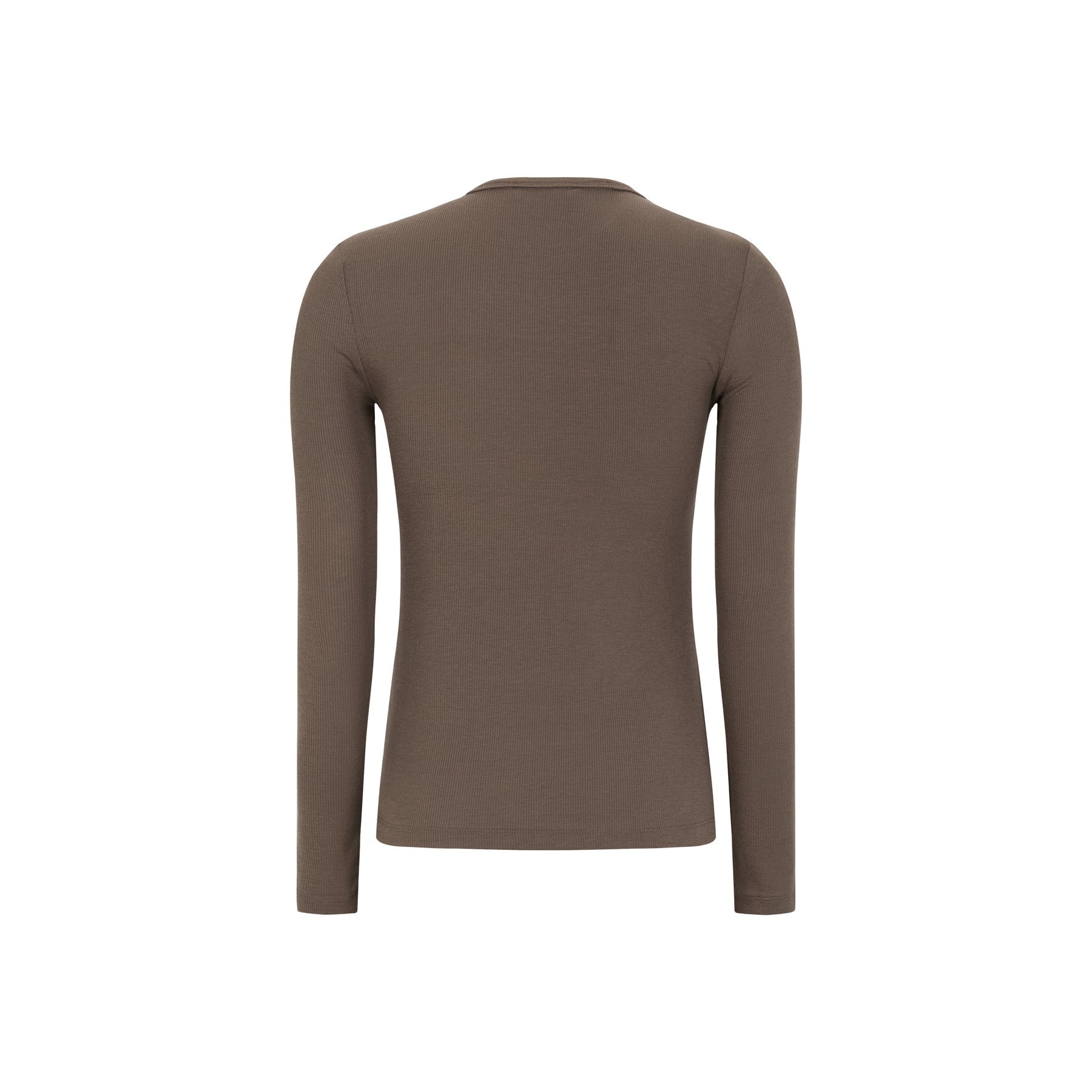 Een bruine nauwsluitende top van een zachte ribkwaliteit. De top is voorzien van een ronde hals en lange mouwen, waardoor het een perfecte basic is voor elke dag. Je kunt de top moeiteloos combineren met een jeans of een rok voor een complete look.