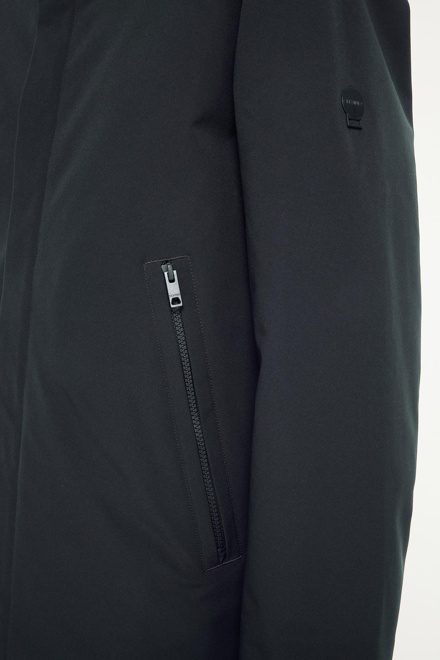 Een donkerblauwe, strakke, middellange winterjas met capuchon, ontworpen voor zware winterse omstandigheden. De jas heeft een Slim Fit en is gemaakt van het actieve Pet Poly 5K-materiaal, een gerecyclede stof die sneldrogend is en 4-wegstretch voor comfort biedt. De jas is gevoerd met 100% gerecyclede, vegan Thermore-vulling, die de warmte en het gevoel van echt dons nabootst.