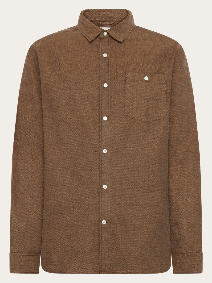 Een bruin, comfortabel en ademend overhemd, gemaakt van zachte biologisch katoenen flanel. De Regular Fit zorgt voor een klassiek silhouet dat bewegingsvrijheid combineert met een nette, gestructureerde look.