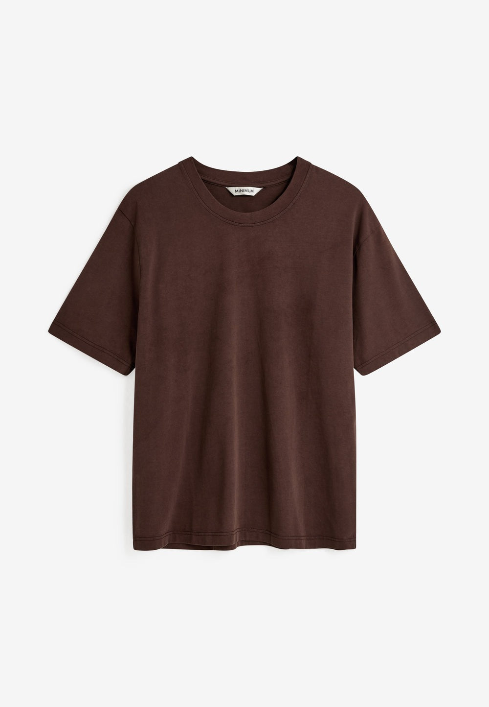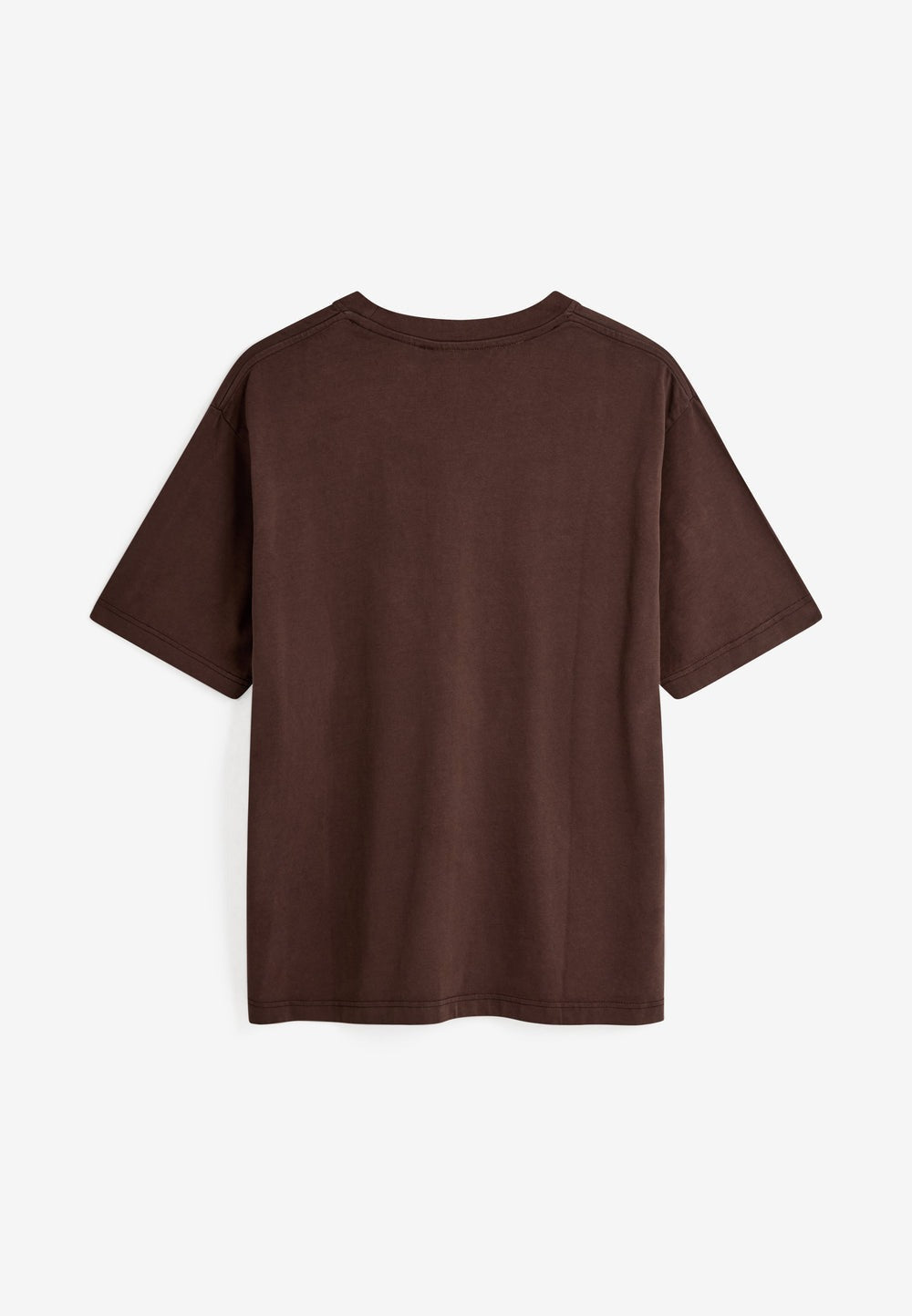 Een bruin, eenvoudig T-shirt met korte mouwen, gemaakt van 100% katoen voor een mooie en eenvoudige kwaliteit. Het T-shirt heeft een boxy pasvorm en is ontworpen met een ronde hals met een geribbelde rand.