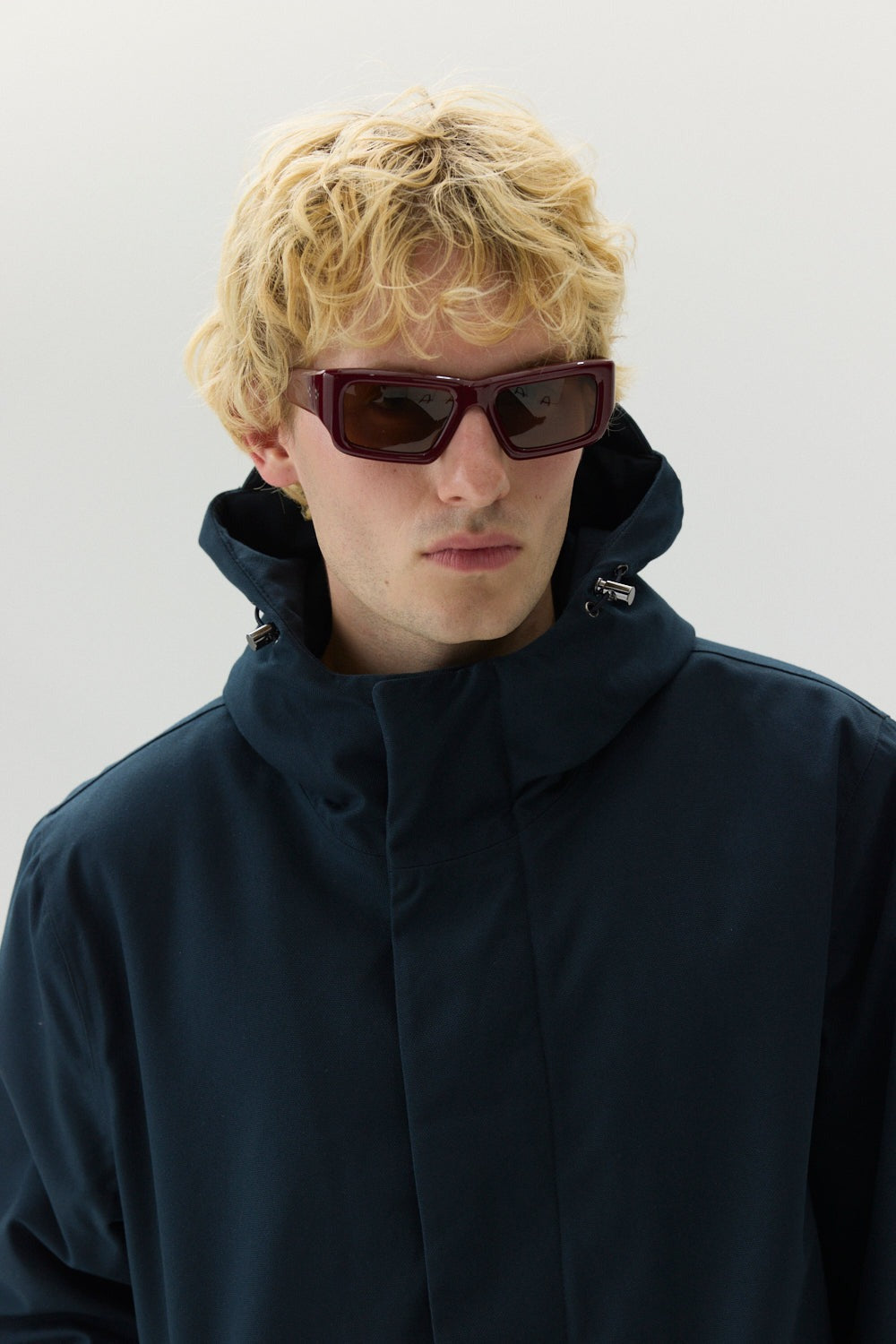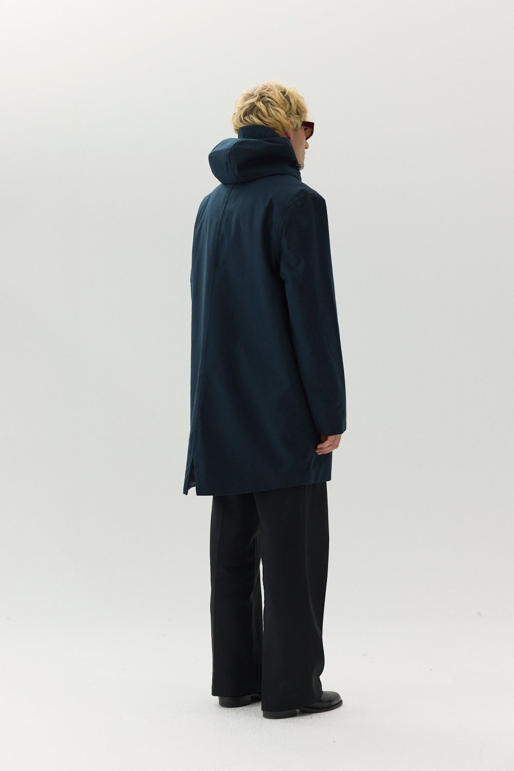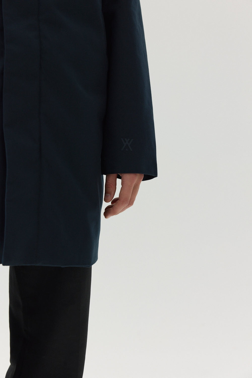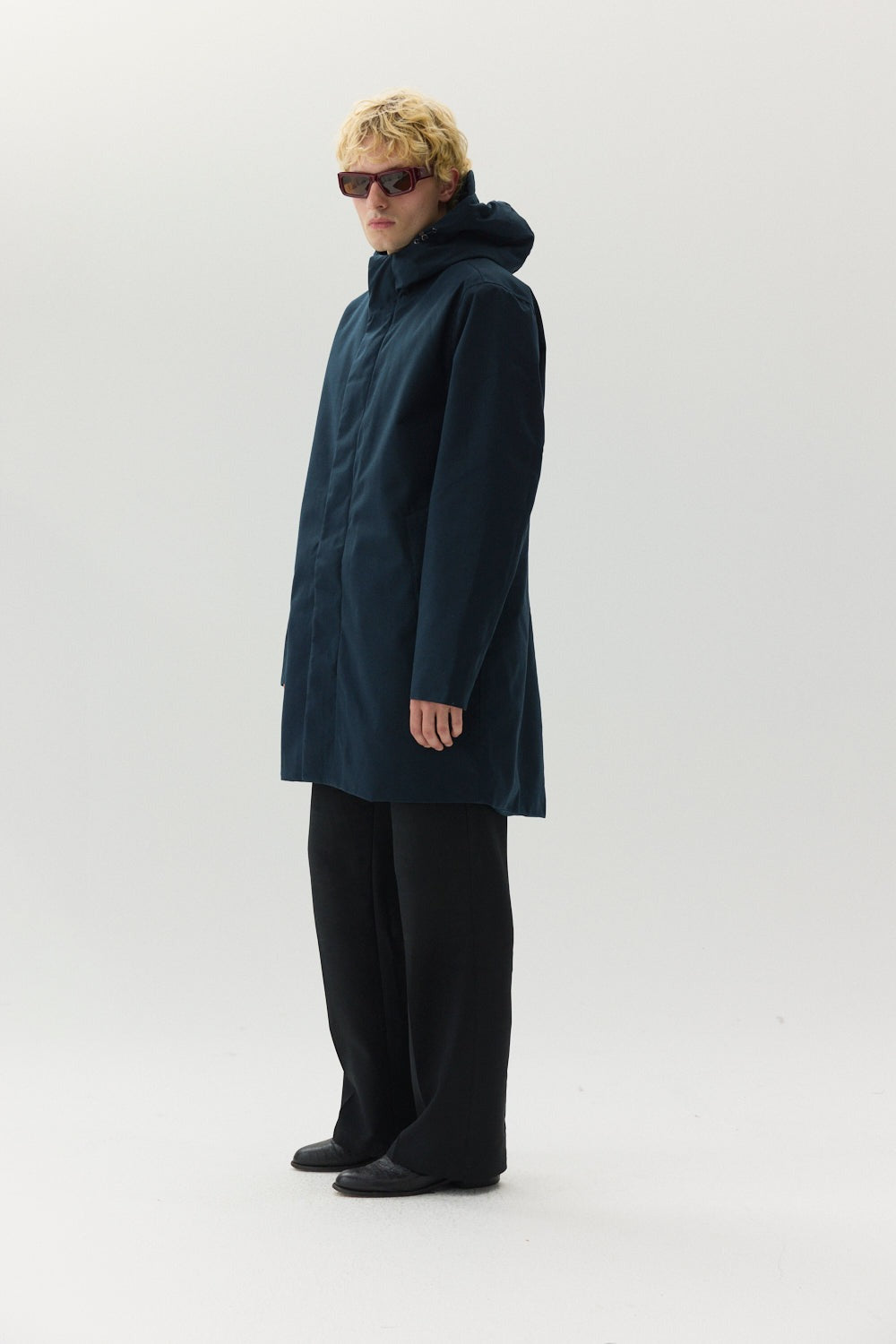 Een donkerblauwe parka die bekend staat om zijn uitstekende pasvorm en minimalistische uitstraling. Het is een klassiek, minimalistisch kledingstuk met volledige functionaliteit eronder. De buitenkant is gemaakt van een waterdichte, hoogwaardige stof (spoiler canvas), die zorgt voor betrouwbare bescherming tegen regen, wind en kou, terwijl het comfort behouden blijft dankzij het ademende vermogen.