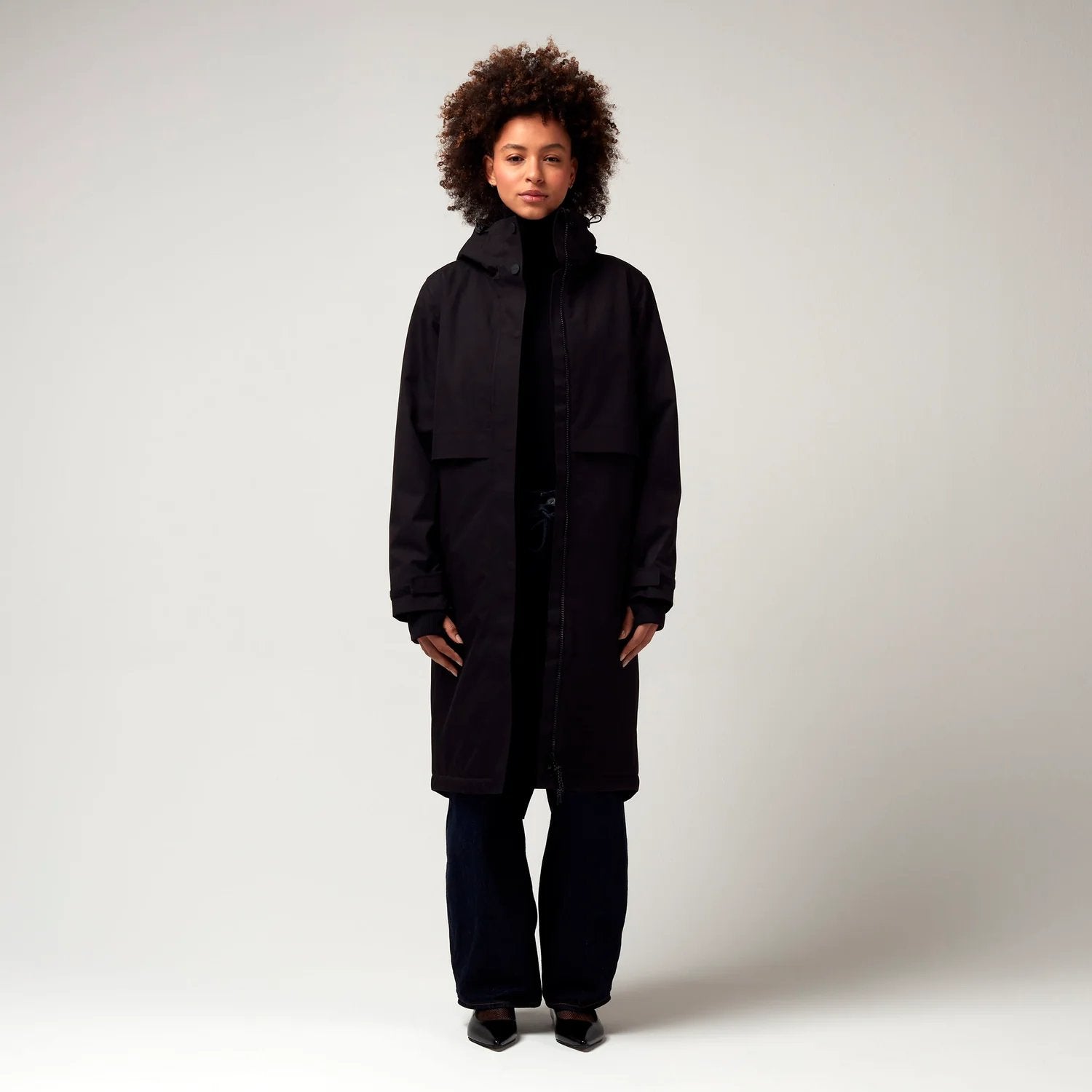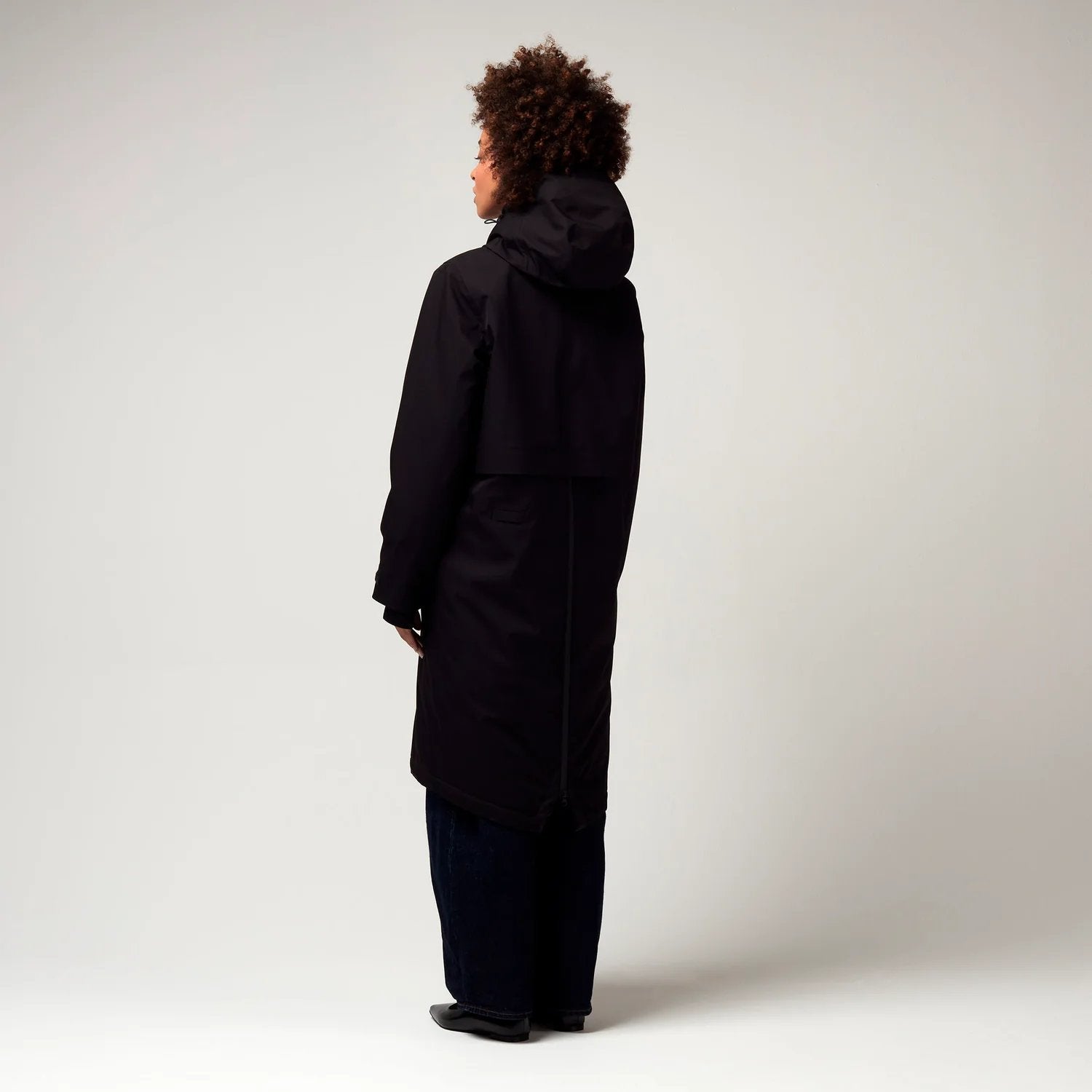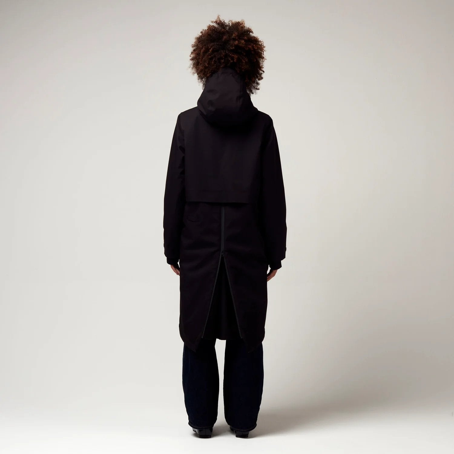 Een zwarte allround parka die perfect is voor woon-werkverkeer. De waterdichte rits aan de achterkant kan geopend worden voor extra ruimte, zodat je beschermd blijft tijdens het fietsen, of het kan als een rugzak gedragen worden als het warmer wordt.