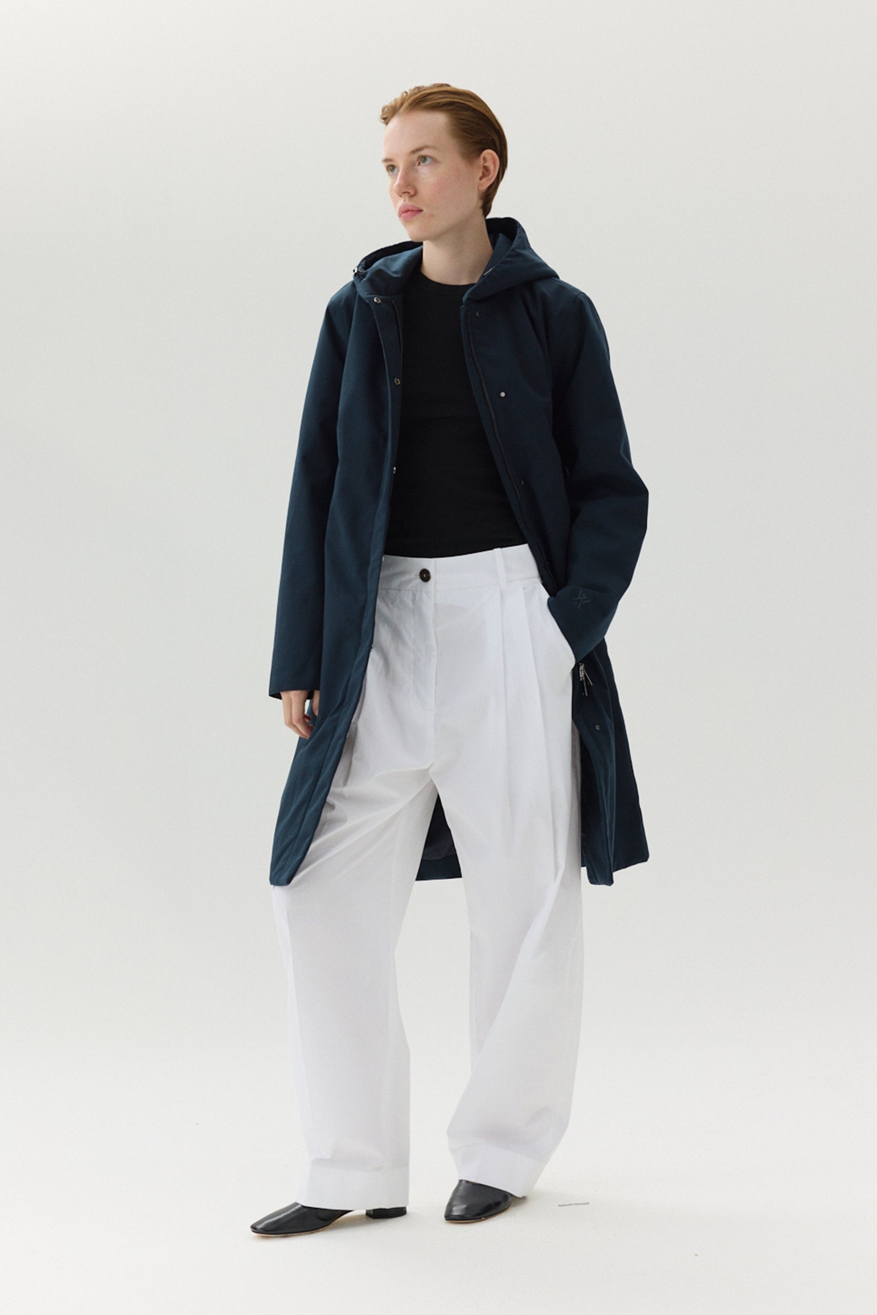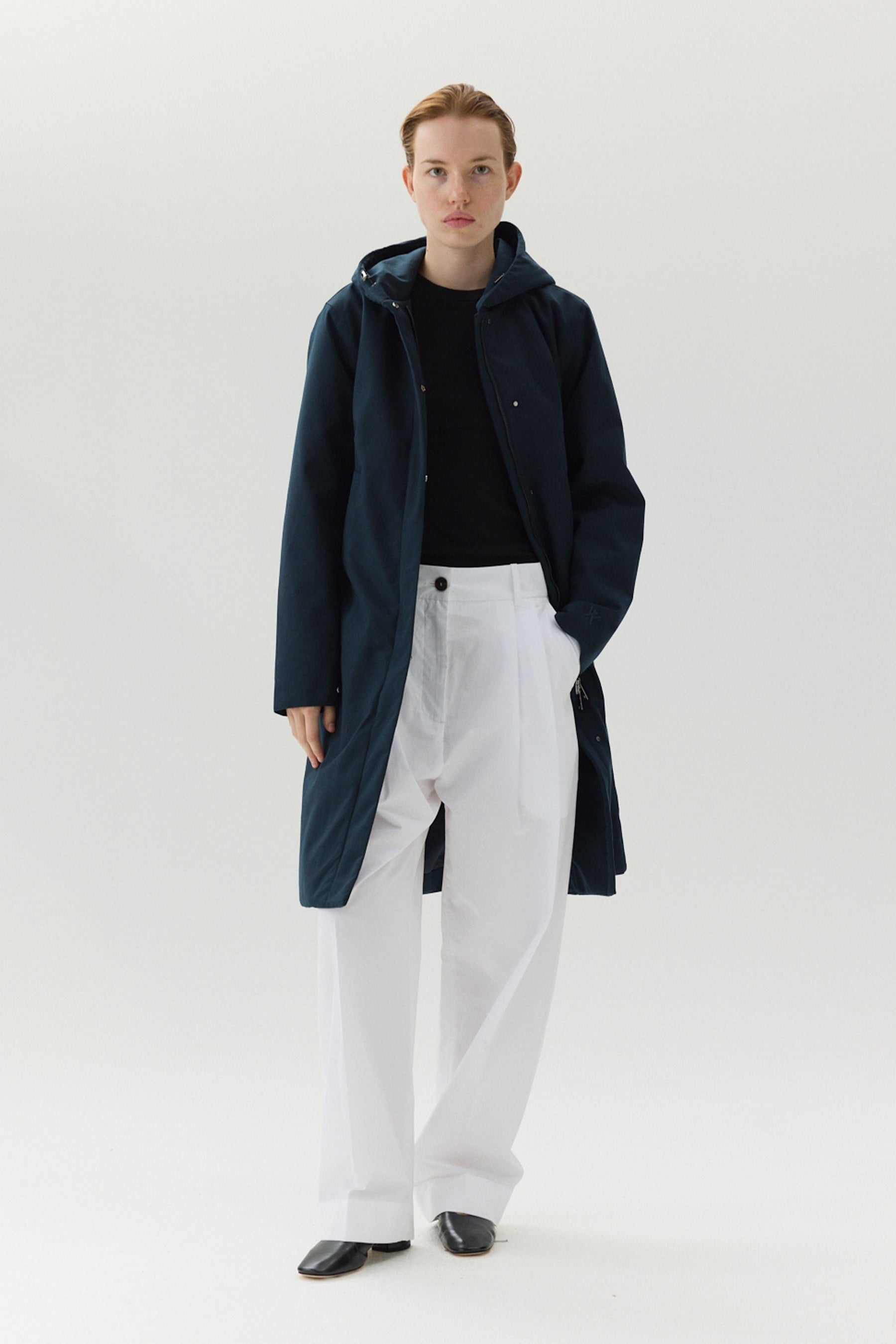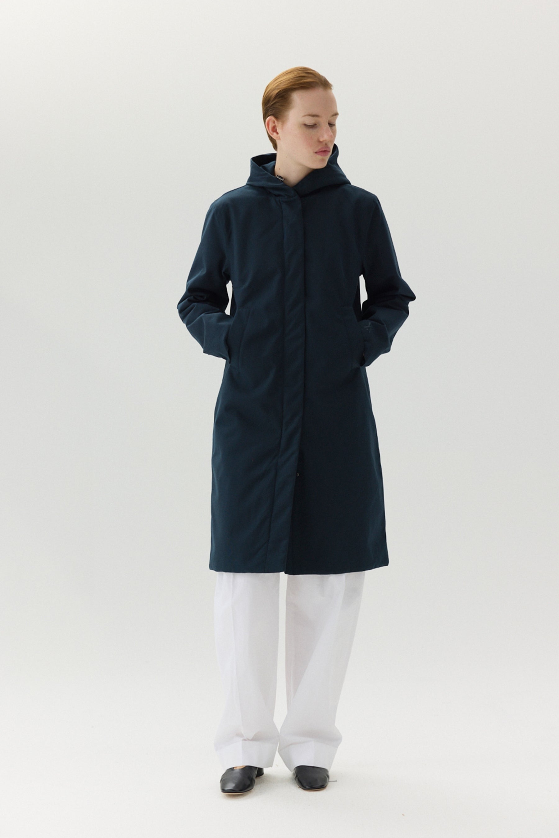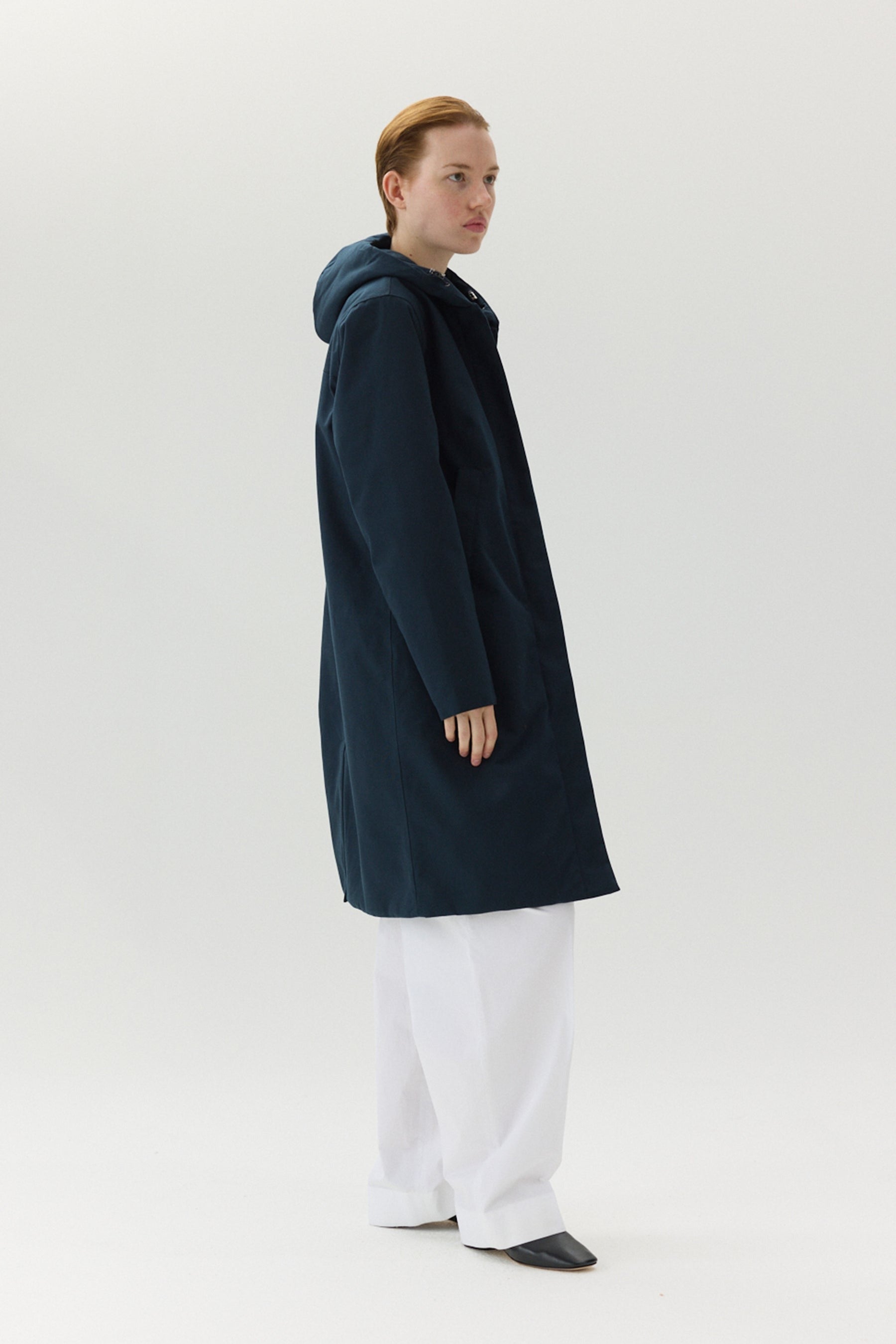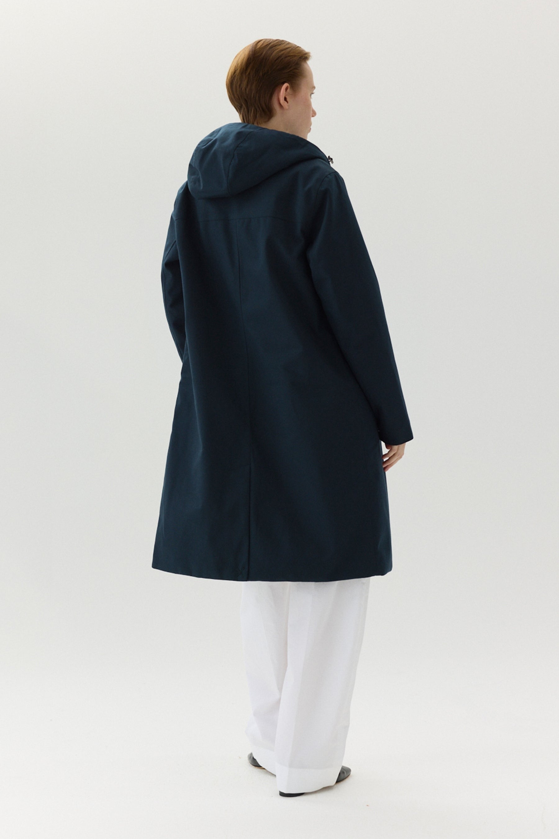 Een donkerblauw, lichtgewicht, stijlvolle parka gemaakt van een zware polyester/canvas 2-laags buitenkant. De pasvorm is getailleerd, maar met een minimalistische look.