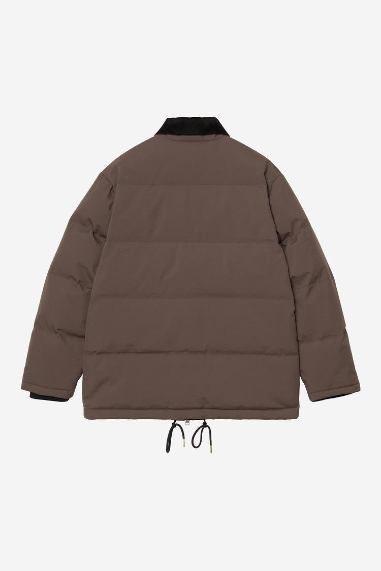 De bruine jas is gemaakt van middelzware nylon canvas en heeft waterafstotende eigenschappen. De jas is voorzien van een tafzijde voering, een verstelbare en afneembare kraag van Corduroy, en vier functionele zakken aan de voorkant met metalen klinknagels.