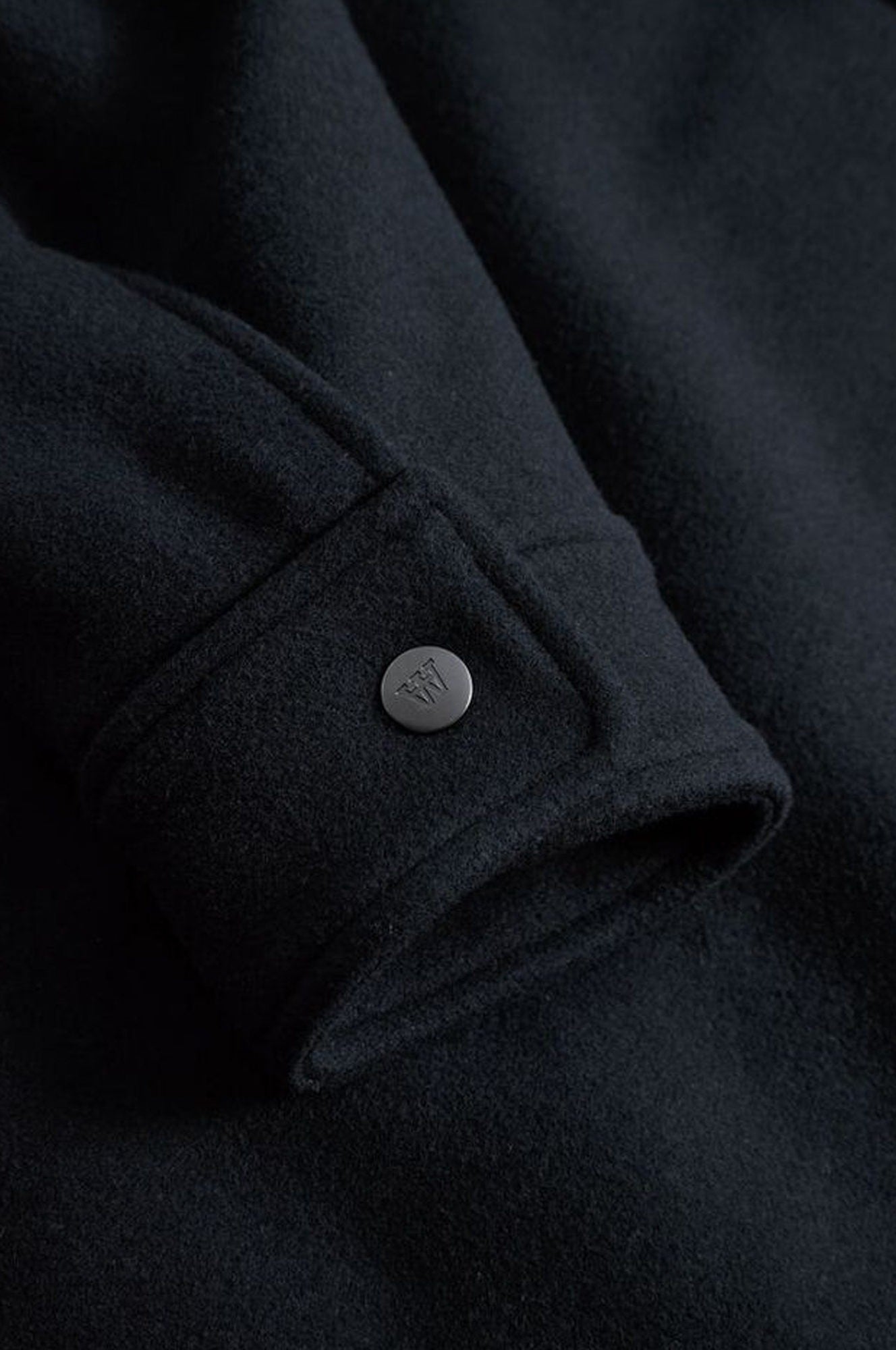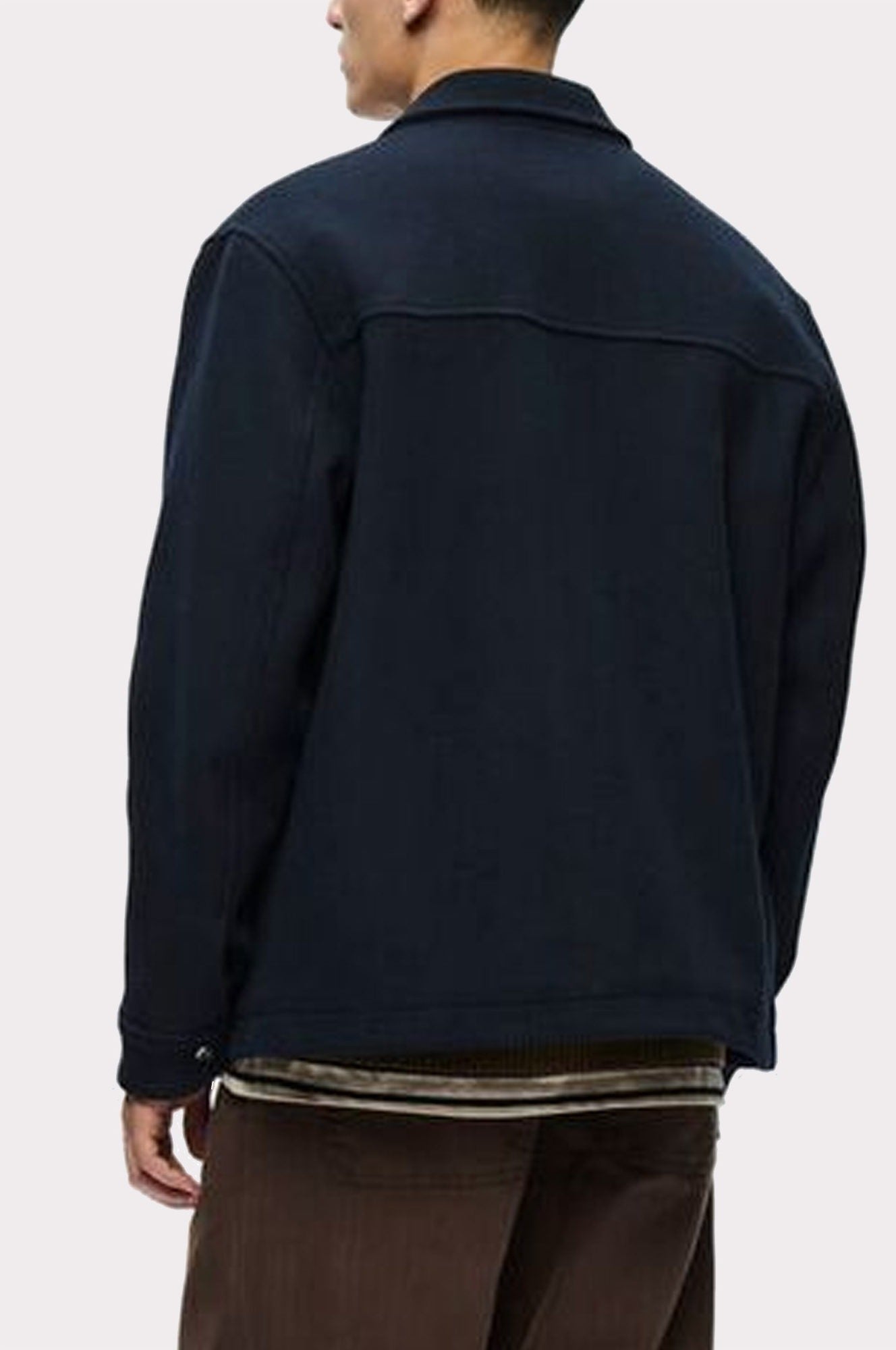 Een donkerblauwe jas met een casual, rechte pasvorm en een zachte, matte afwerking. Het jack heeft een kraag, een schone drukknoopsluiting aan de voorkant, paspelzakken en subtiele tonale borstdetails die het gestroomlijnde silhouet bepalen. Met lange mouwen is dit een veelzijdig en stijlvol item voor de tussenseizoenen.