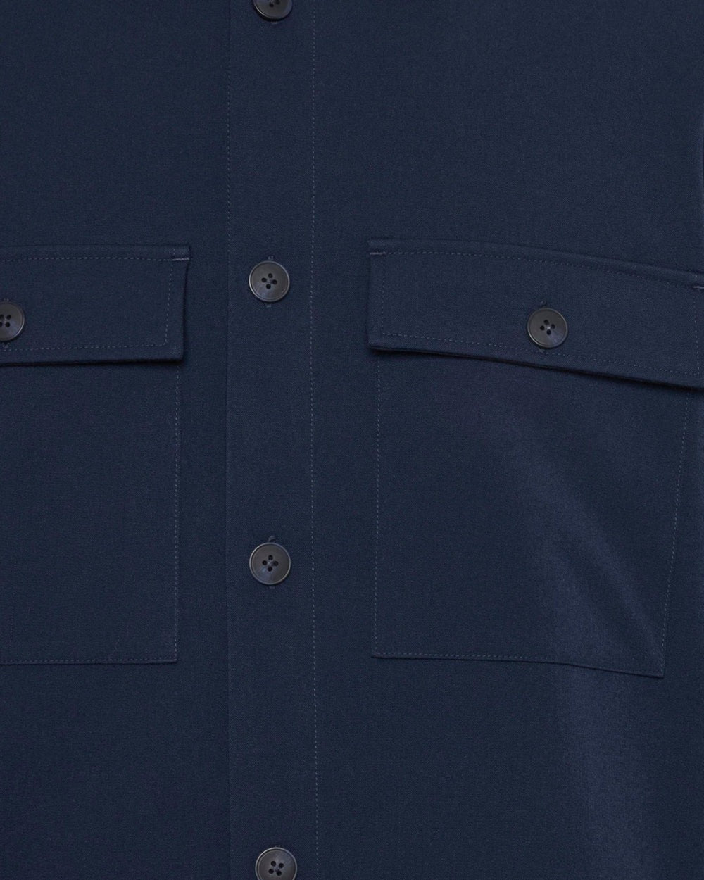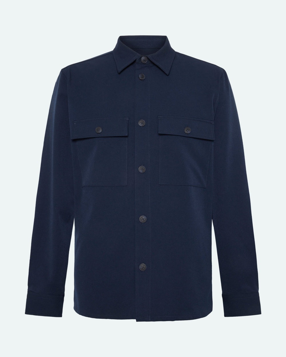 Een donkerblauw overshirt met lange mouwen gemaakt van een licht elastische mix van polyester, viscose en elastaan, wat zorgt voor bewegingsvrijheid en comfort. Het heeft een klassiek silhouet met een traditionele kraag, een volledige knoopsluiting en twee praktische borstzakken. Door het gestructureerde en veelzijdige ontwerp is het geschikt voor zowel casual als gekledere looks.