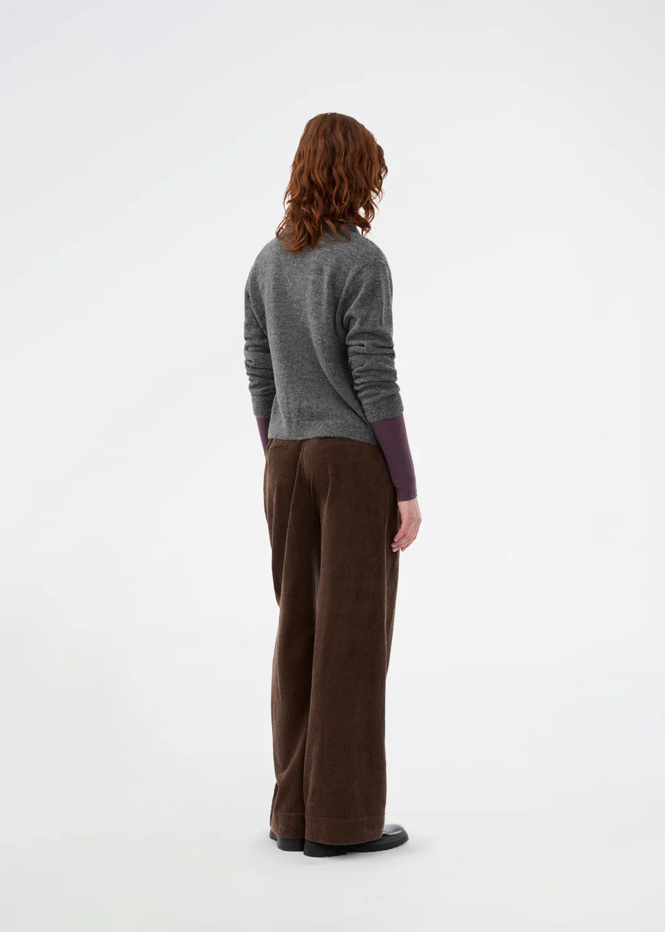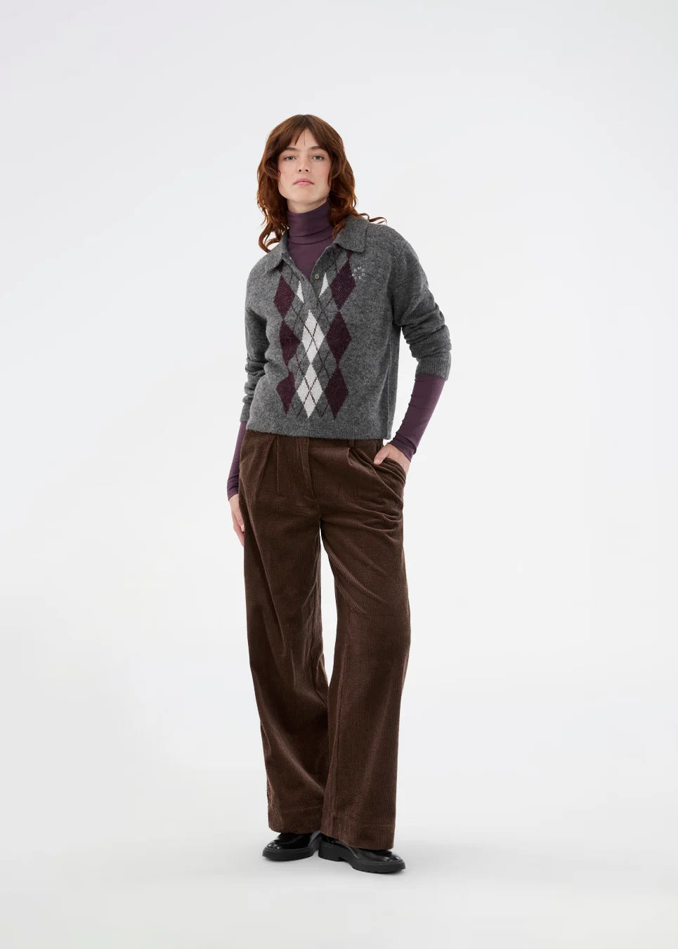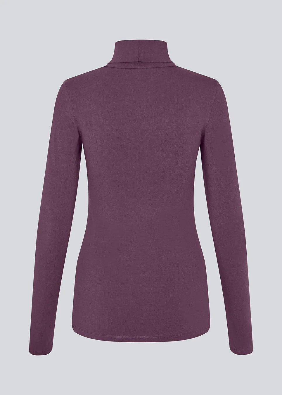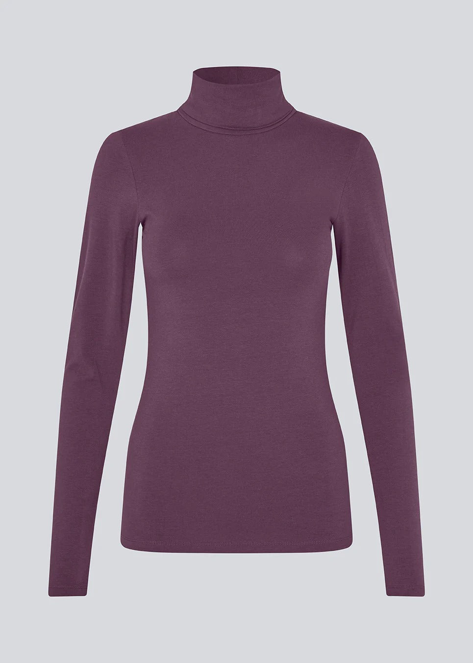 Een paars gebreid trui met een hoge hals en een strakke pasvorm. De trui is gemaakt van een zachte mix van modal, katoen en elastaan, waardoor deze comfortabel is en perfect voor elke gelegenheid.