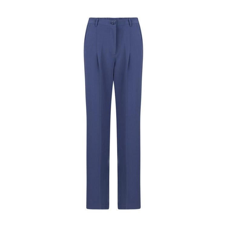 Een blauwe stijlvolle en comfortabele pantalon voor dagelijks gebruik. De broek is ontworpen met een flatteuze hoge taille en een elastische achterzijde, wat zorgt voor een flexibele pasvorm die zijn vorm behoudt. De ingenaaide plooien aan de voorzijde geven de broek een verzorgde uitstraling, waardoor dit item perfect is voor zowel casual als meer geklede momenten.