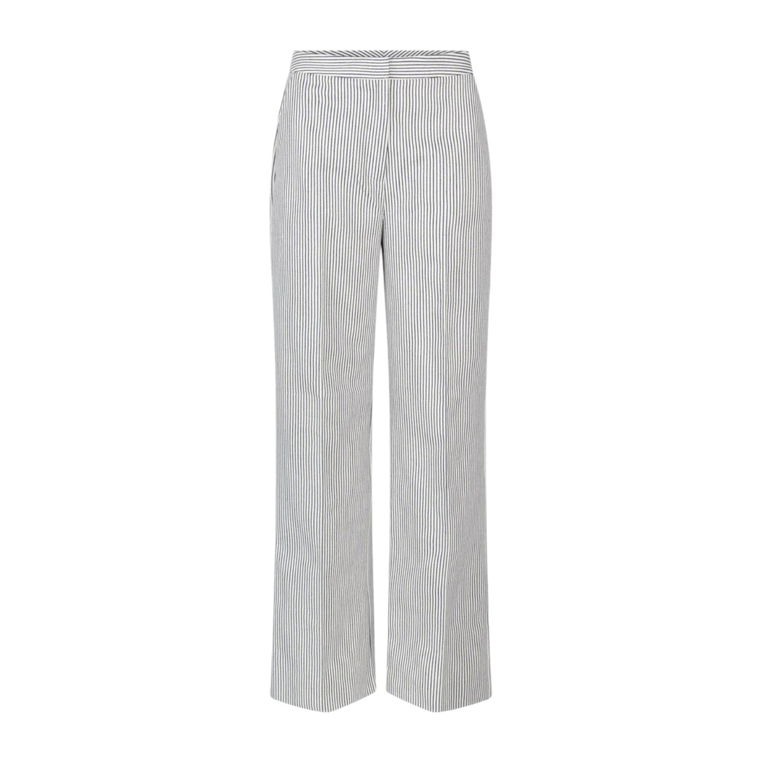 Een elegante damesbroek die een rustige maar opvallende upgrade aan je outfit geeft. De broek heeft een klassieke donkerblauw/ecru krijtstreep en een 'wide leg' pasvorm die soepel langs het been valt, wat zorgt voor een lange en slanke lijn. Dankzij de 'regular waist' sluit de broek mooi aan in de taille, waardoor dit item uitermate geschikt is voor zowel formele werkdagen als ontspannen momenten in je vrije tijd.