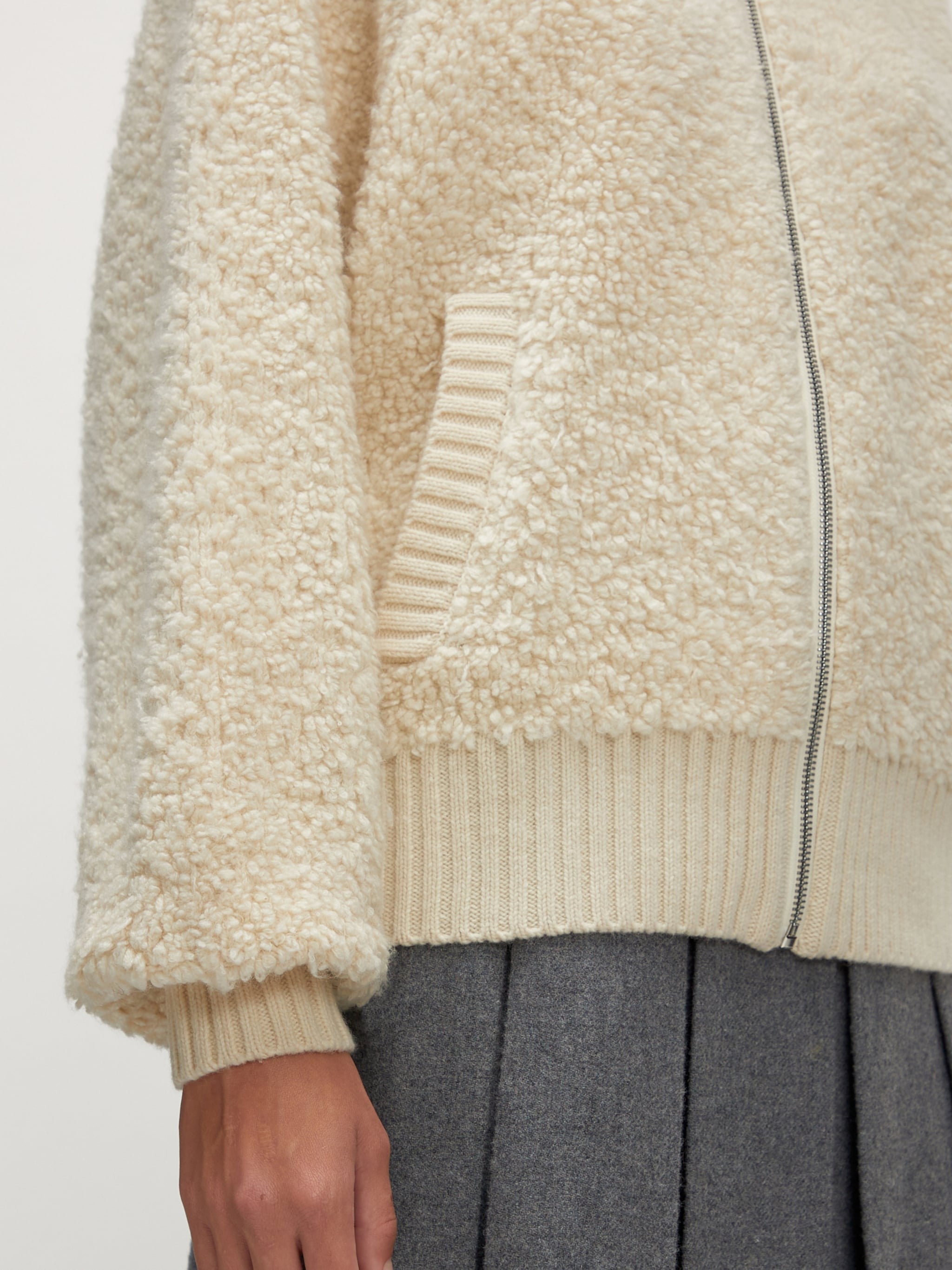 Een beige gebreid vest met lange mouwen en een normale pasvorm. Het vest is gemaakt van een mix van wol en polyamide en heeft een ritssluiting.
