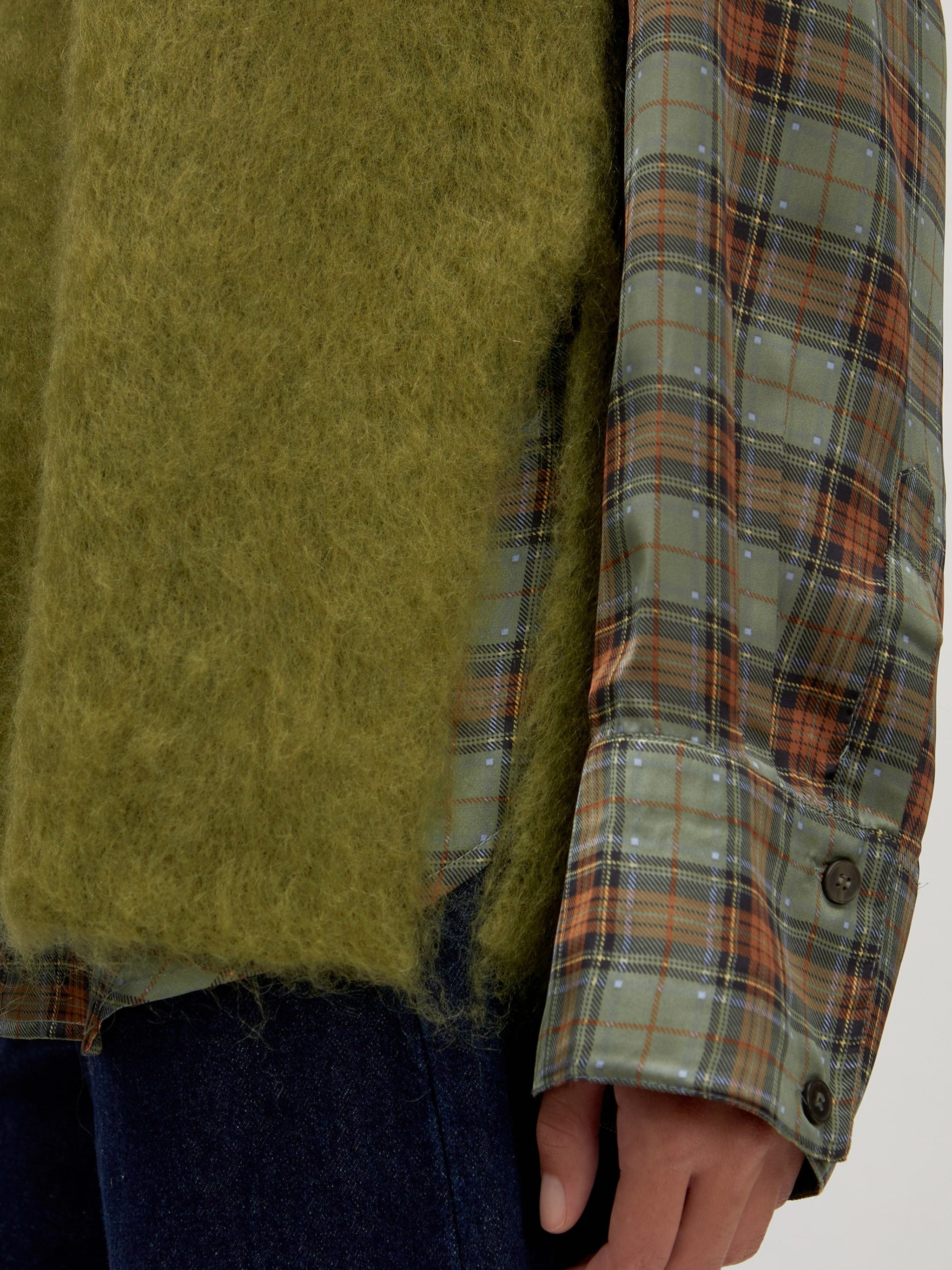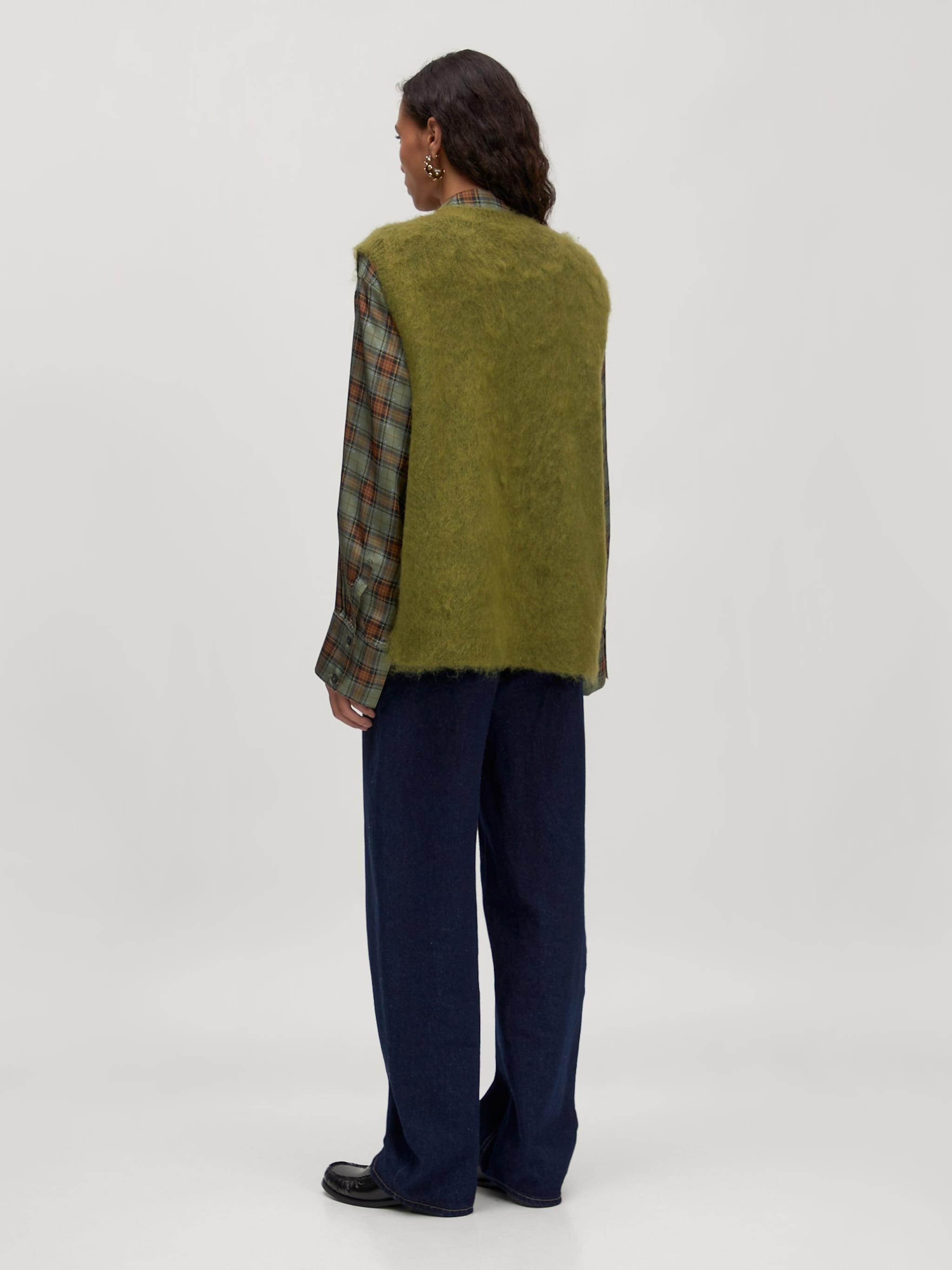 Een groene mouwloze trui met een normale pasvorm. De trui is gemaakt van een mix van materialen, waaronder mohairwol en wol en heeft een split aan de beide zijkanten.