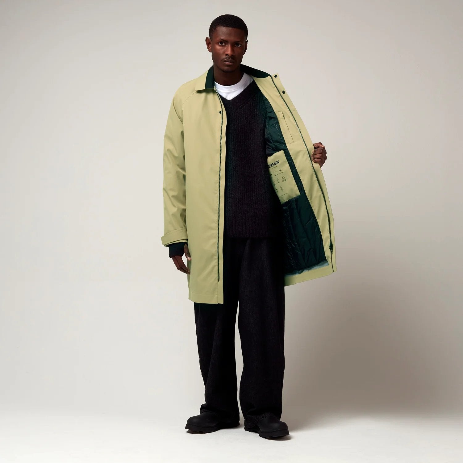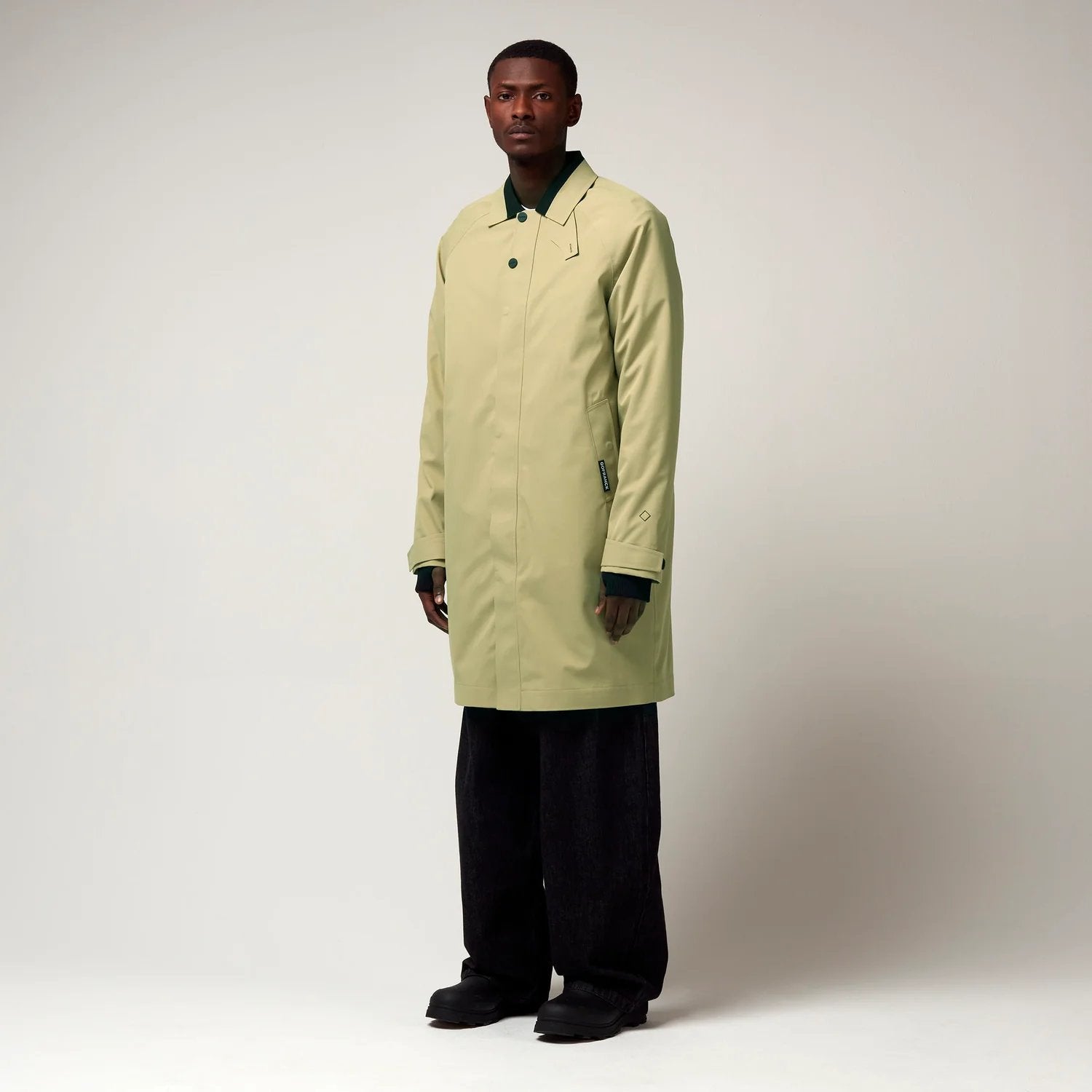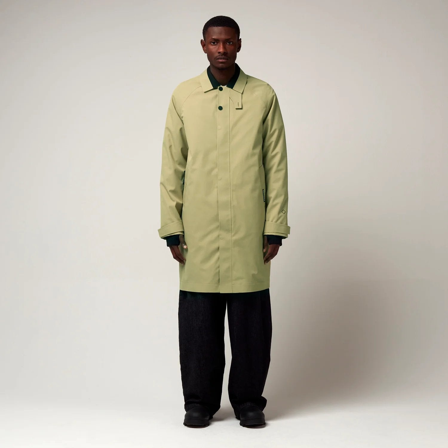 Een groen kleurige klassieke jas met een frisse twist. Deze opvallende jas combineert een traditioneel silhouet met eigentijdse details. De contrasterende kraag en de omkeerbare kinband voegen een vleugje kleur toe aan de stijl.