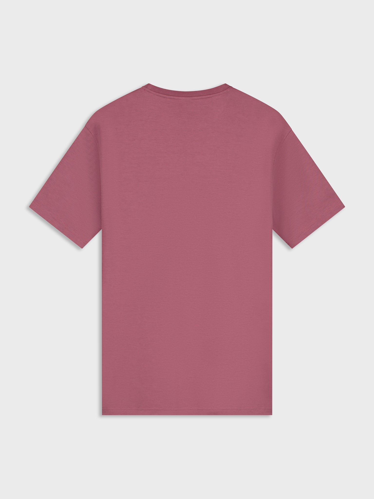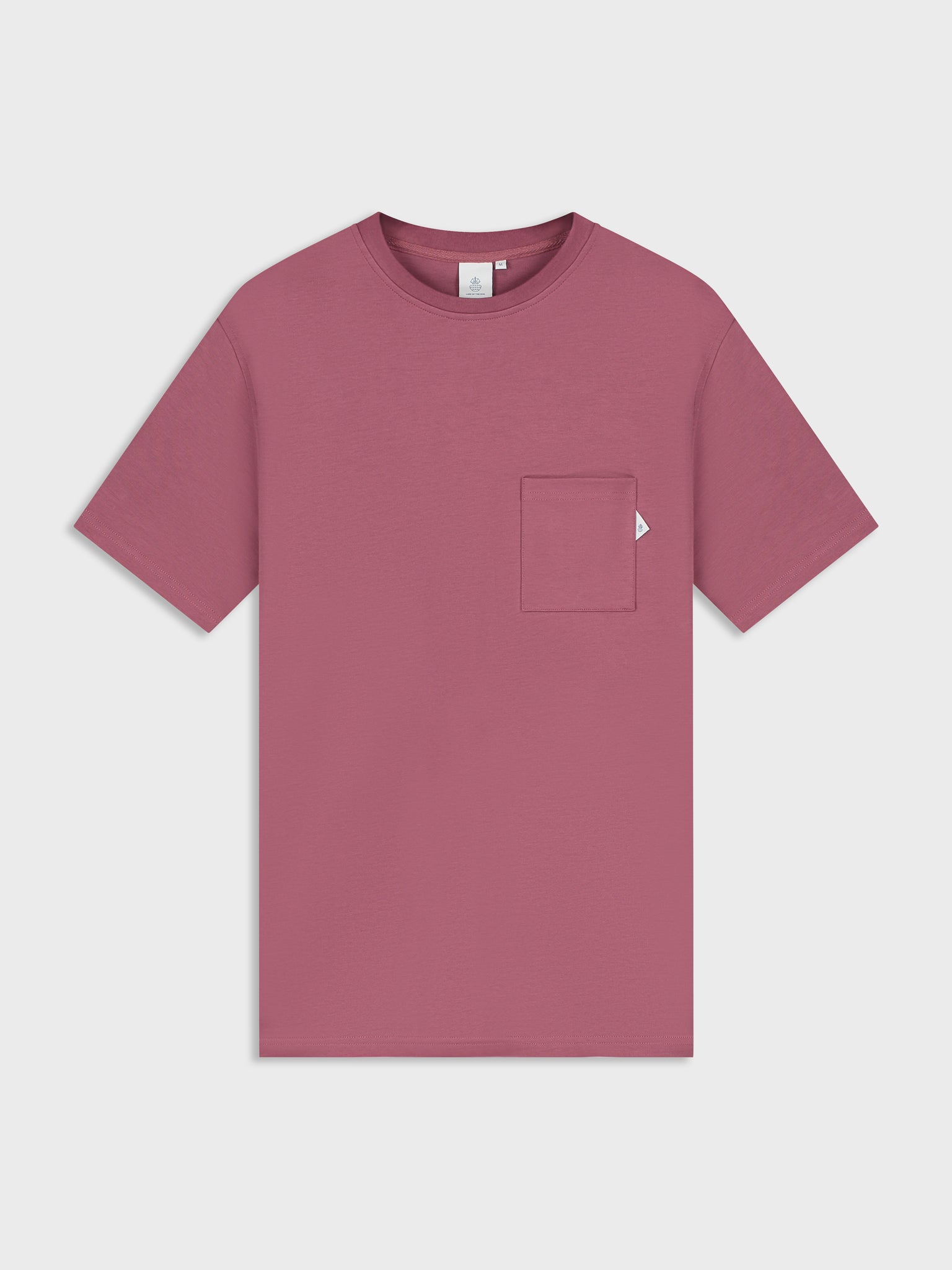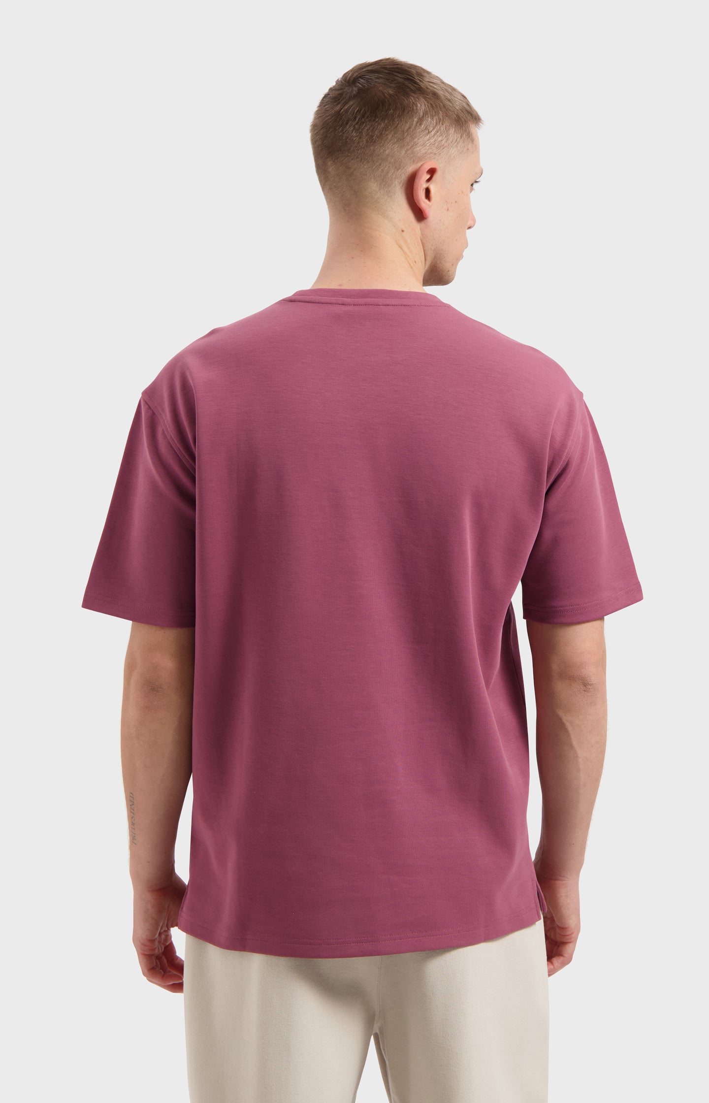 Een rood roze, robuust en hoogwaardig kledingstuk voor heren. Dit T-shirt is vervaardigd van een zware 'heavy jersey' stof (300gsm) met een interlock-binding, wat zorgt voor een stevige en luxe uitstraling. Het ontwerp is minimalistisch en functioneel, met een borstzakje en subtiele zijsplitjes voor extra bewegingsvrijheid. Dankzij de mix van katoen, polyester en elastaan is het shirt niet alleen comfortabel, maar behoudt het ook uitstekend zijn vorm.