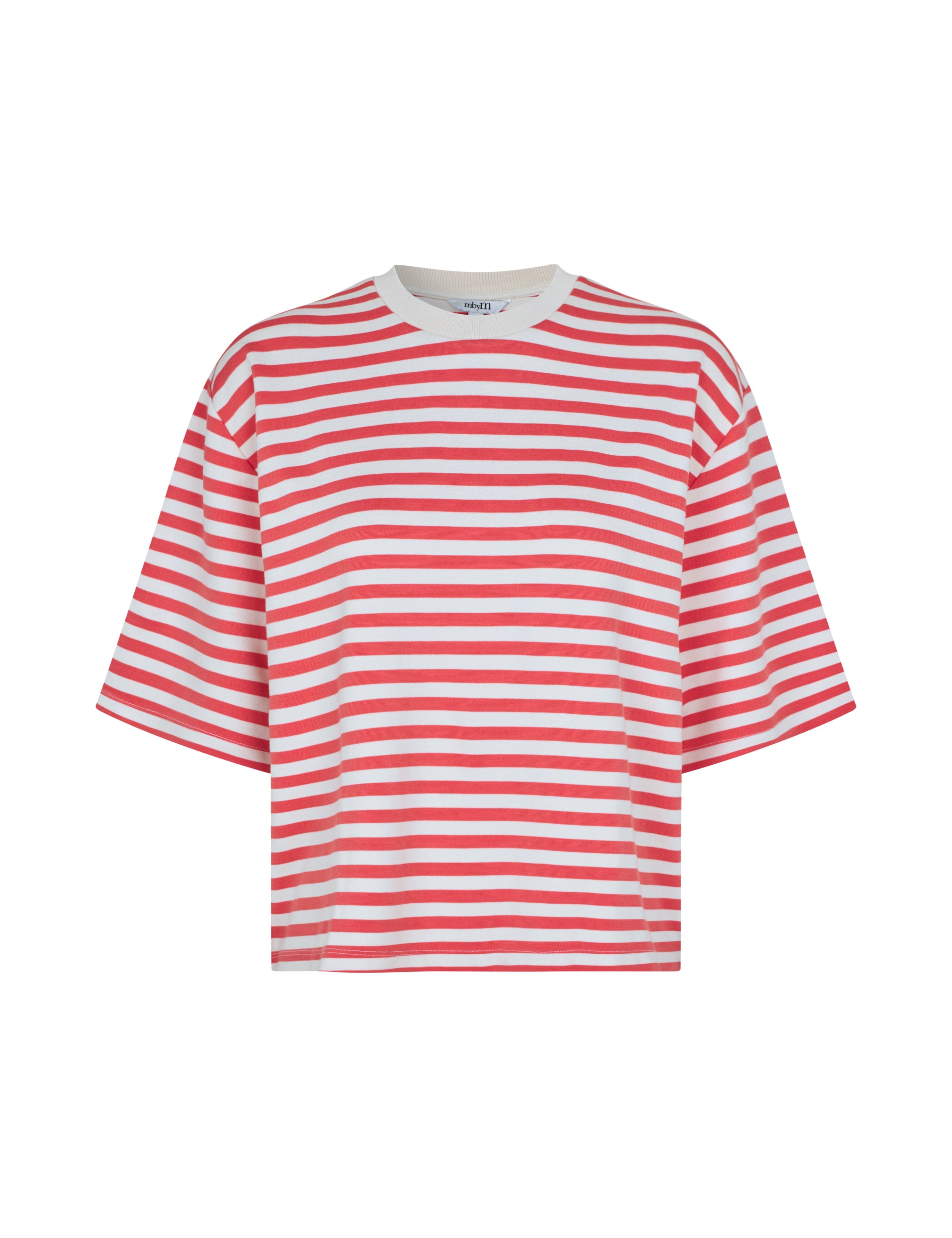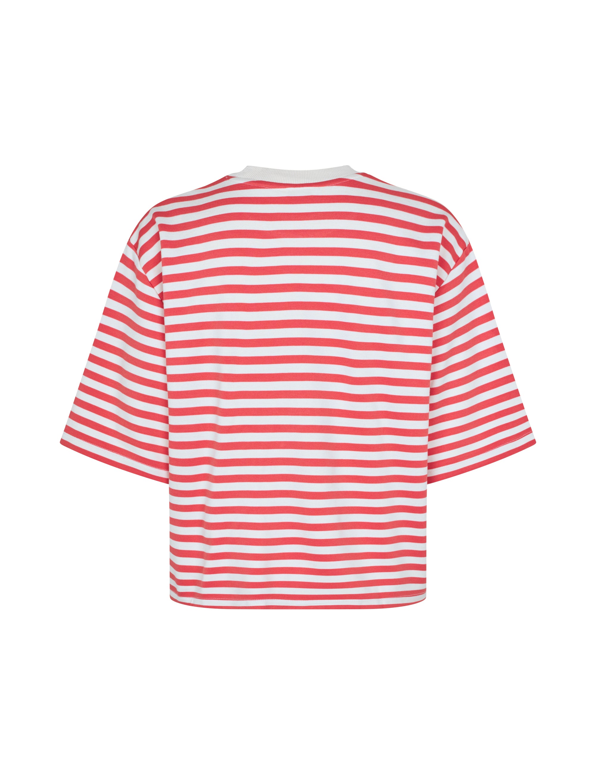 Een vrolijk en comfortabel t-shirt met een klassiek streeppatroon. Dit shirt heeft een losse pasvorm en een kortere lengte, wat zorgt voor een moderne en speelse look. Het T-shirt is gemaakt van een zachte viscosemix met elastaan, waardoor het soepel valt en prettig meebeweegt. Een opvallend detail is de witte rand bij de ronde hals, die een fris contrast vormt met de Amber Glow-tint. Dit shirt is de ideale keuze voor een casual outfit en combineert uitstekend met een high-waisted jeans of pantalon.