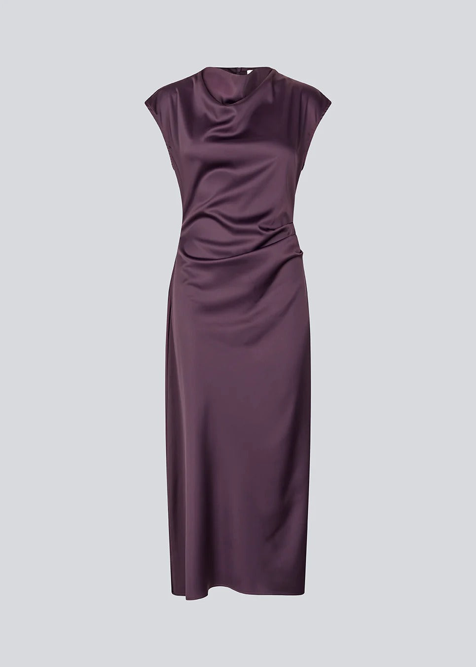Een paarse mouwloze maxi-jurk met een elegant ontwerp. De jurk is gemaakt van satijn, heeft een hoge halslijn en is verfijnd met plooien aan de zijkant en een split in de zijnaad. De jurk sluit aan de achterkant met een onzichtbare rits.