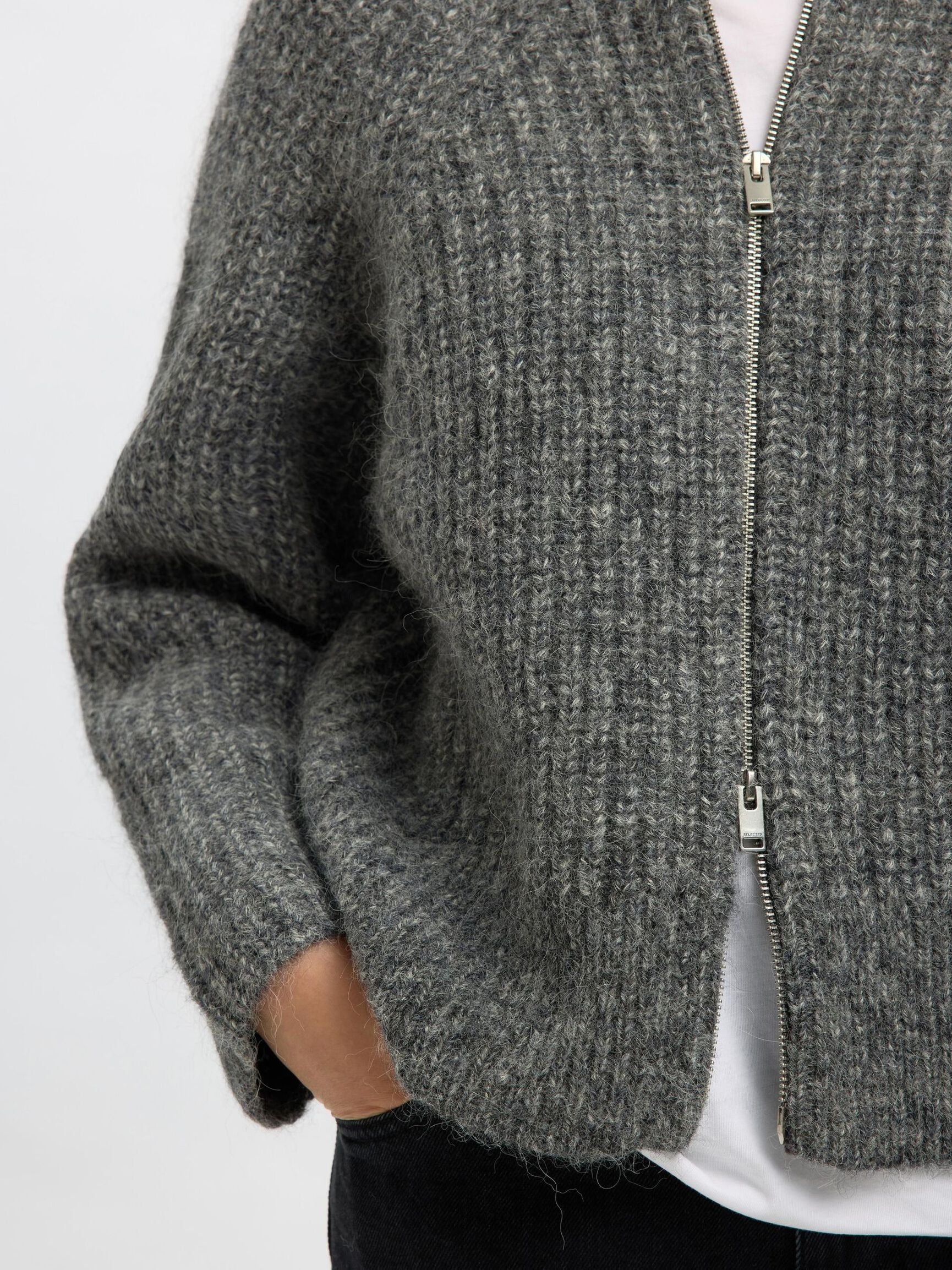 Een grijze cardigan met een hoge kraag en rits, ideaal om je knitwear-collectie een upgrade te geven. Het vest heeft een dubbel deelbare rits aan de voorkant en lange raglanmouwen. Het is perfect om te dragen over een T-shirt en te combineren met een jeans voor een complete weekendlook.