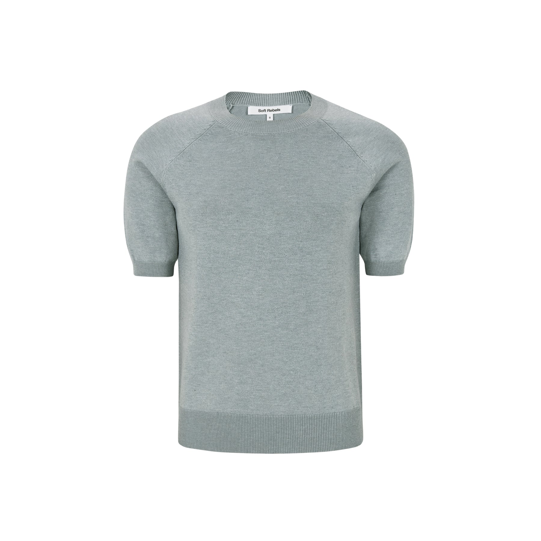 Een blauwegroene, verfijnde, fijngebreide top die de perfecte balans vindt tussen een T-shirt en een trui. Dit item is gemaakt van een zachte materiaalmix die zorgt voor een soepele valling en een luxueus gevoel op de huid. De top heeft een klassieke ronde hals en korte mouwen, afgewerkt met subtiele ribboorden voor een verzorgde uitstraling. Dankzij het minimalistische ontwerp is deze gebreide blouse een veelzijdig basisstuk dat zowel solo gedragen kan worden als onder een blazer of vest.