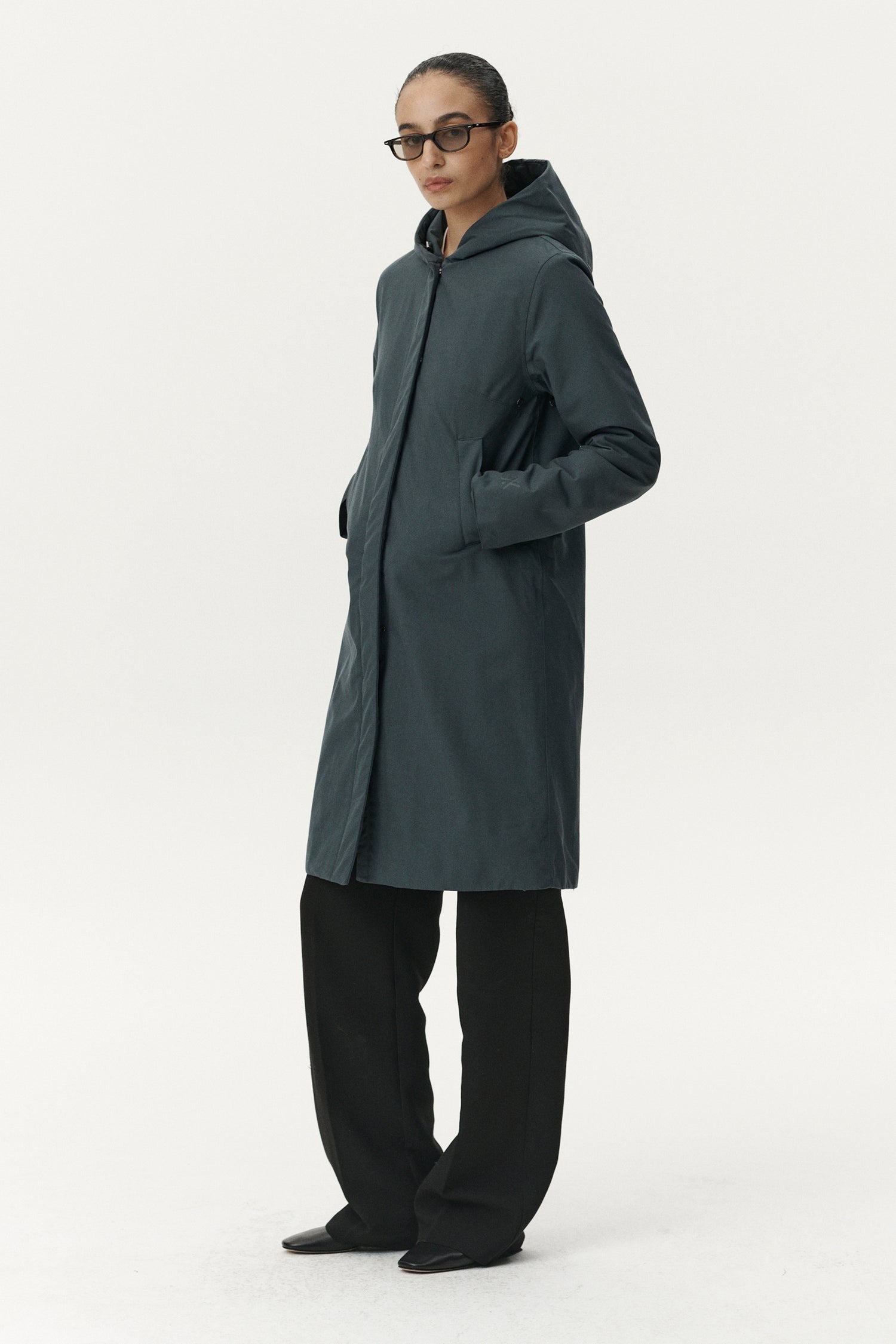 Een groenkleurig, lichtgewicht en stijlvolle parka gemaakt van een zware polyester/canvas 2-laags buitenkant. Het heeft een strakke, minimalistische look.