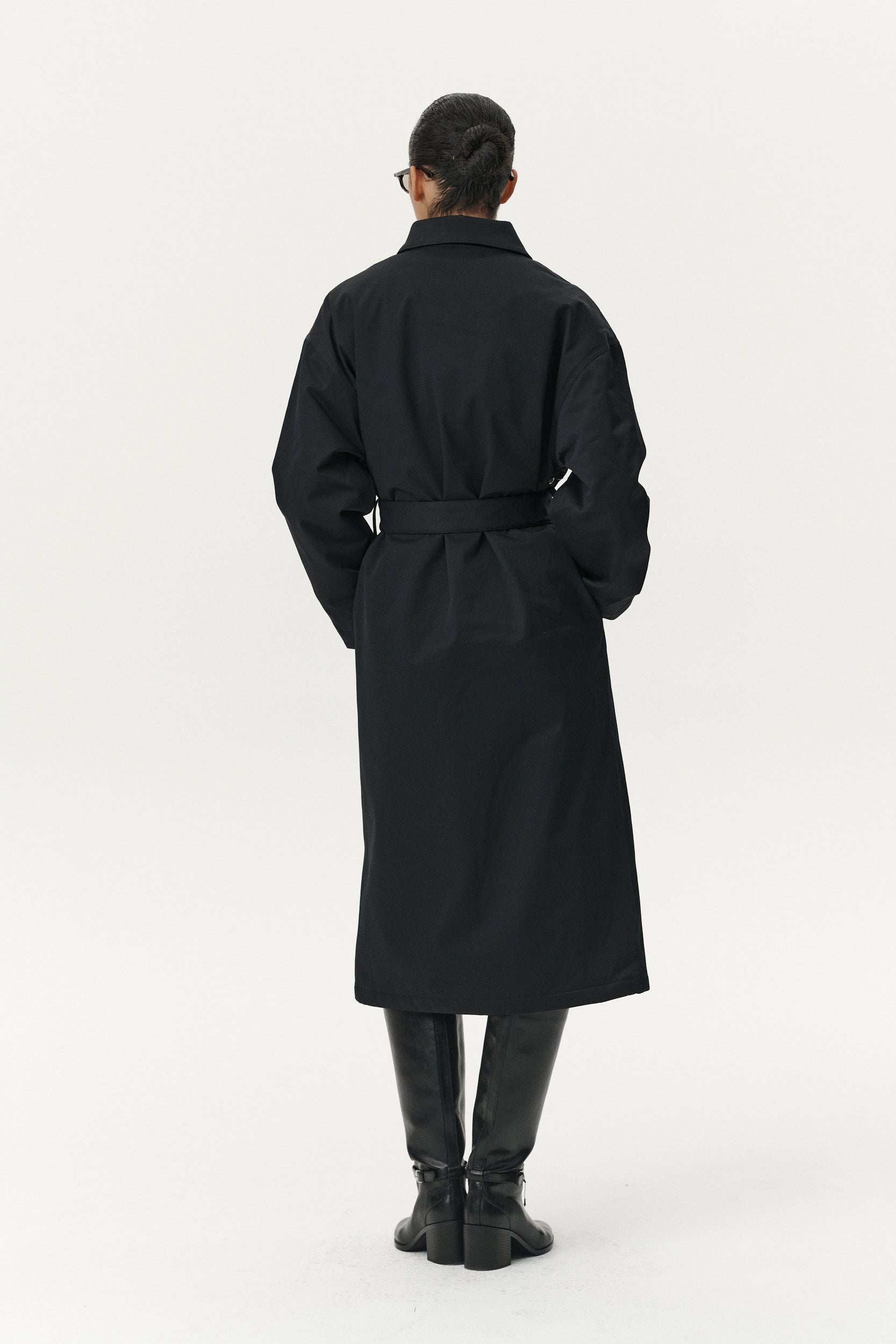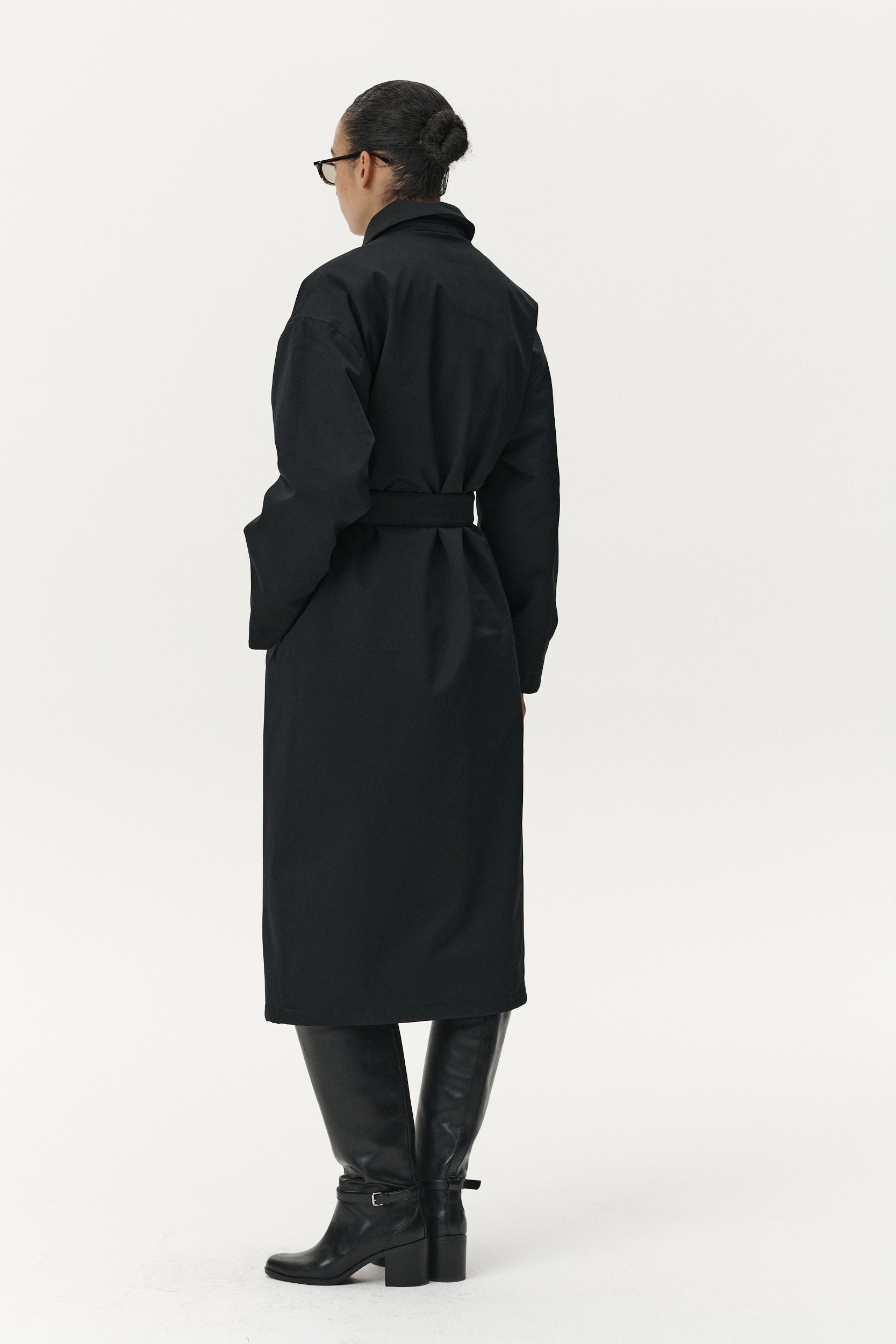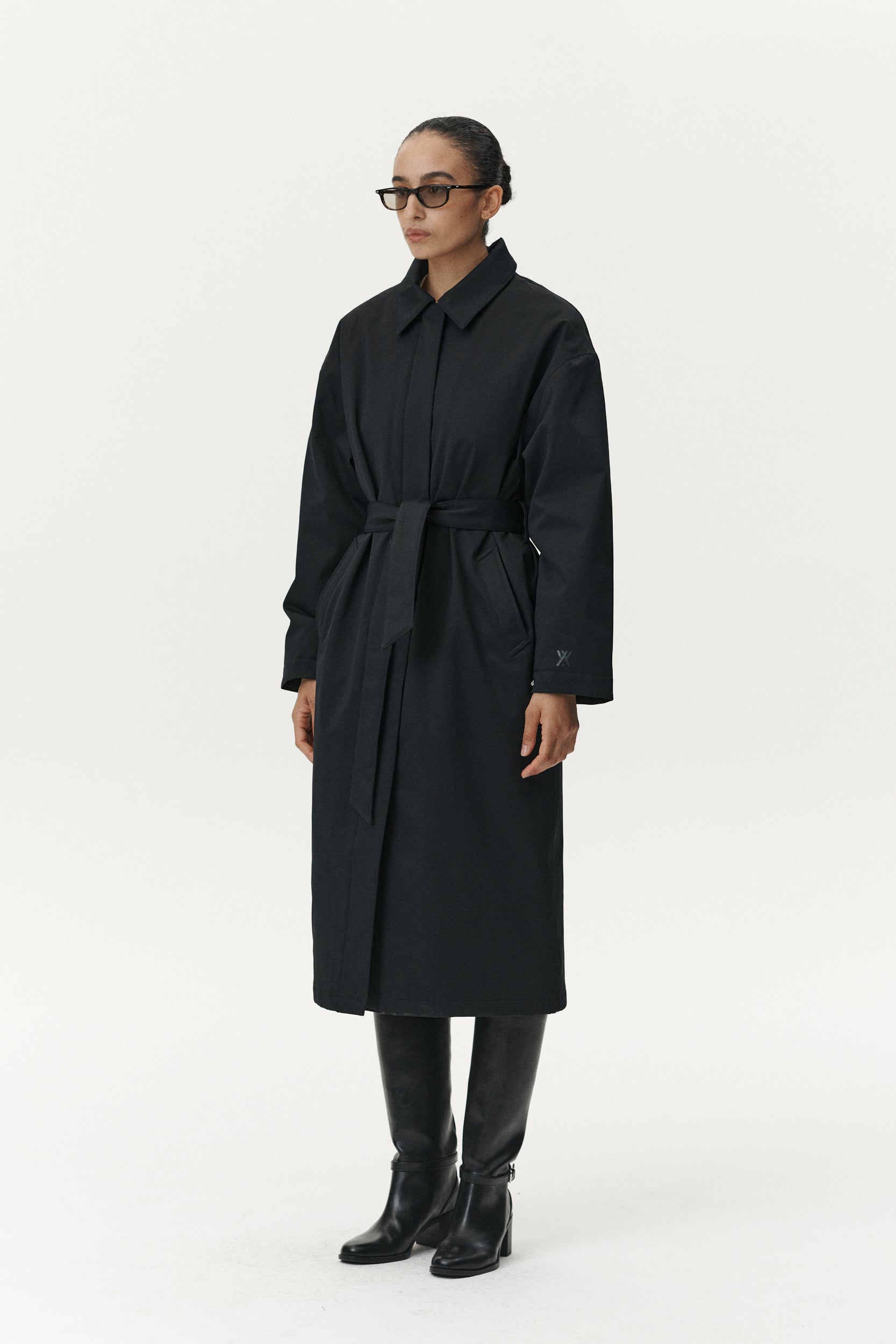 Een donkerblauwe ruime trenchcoat met verlaagde schouders. Het is een klassieke stijl met een rekbare keperstof van polyester. De jas is zeer licht en stijlvol, en kan gedragen worden met de ceintuur aan de voor- of achterkant.