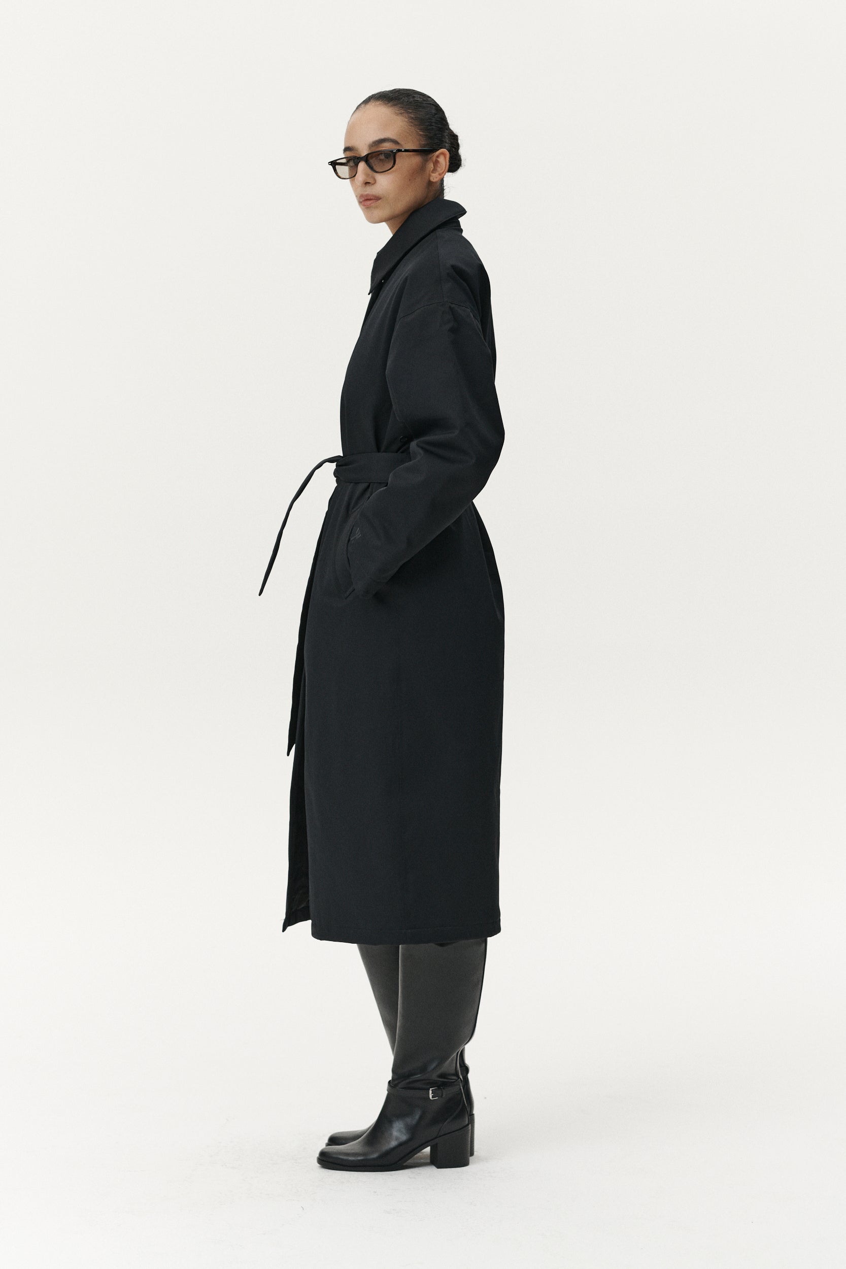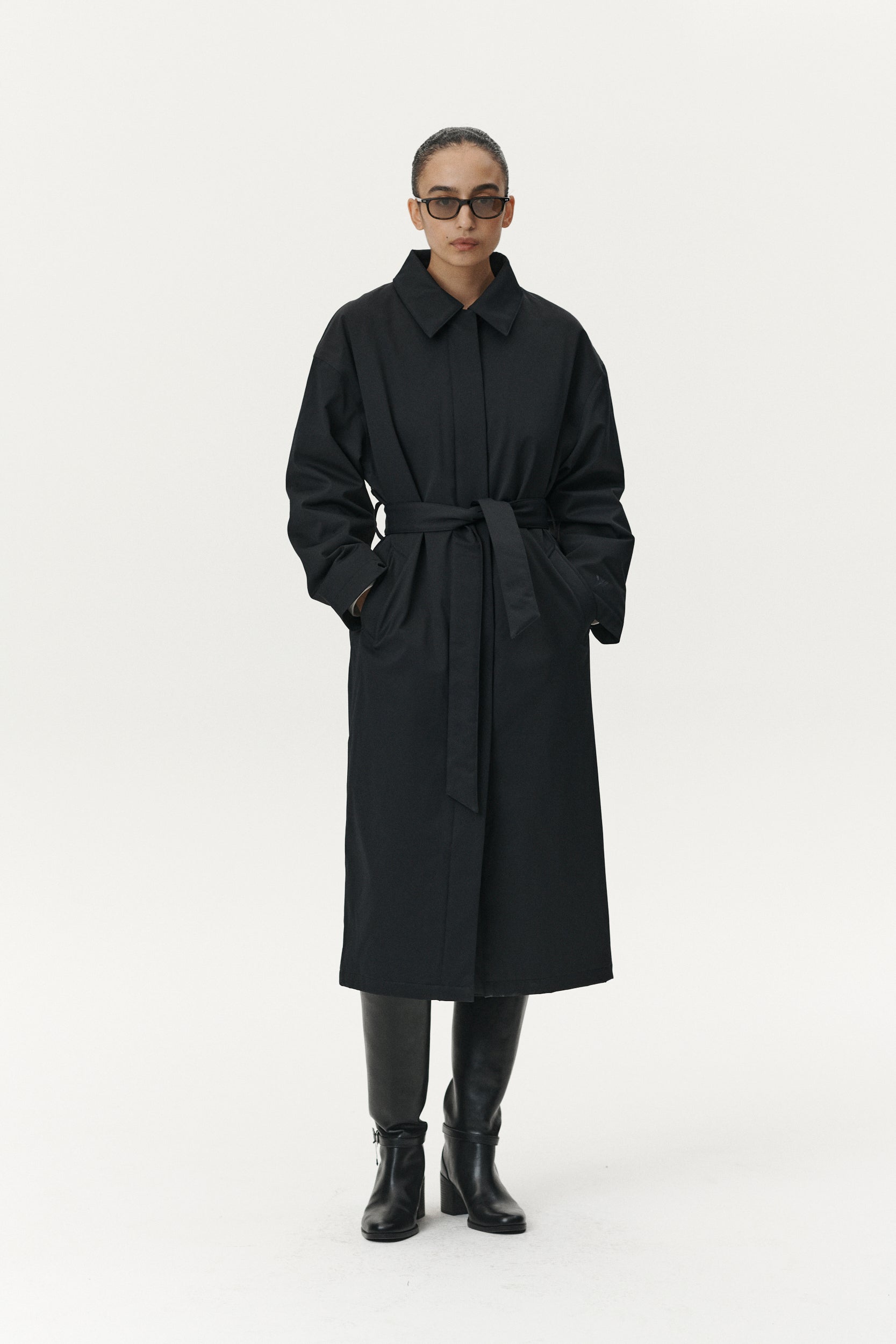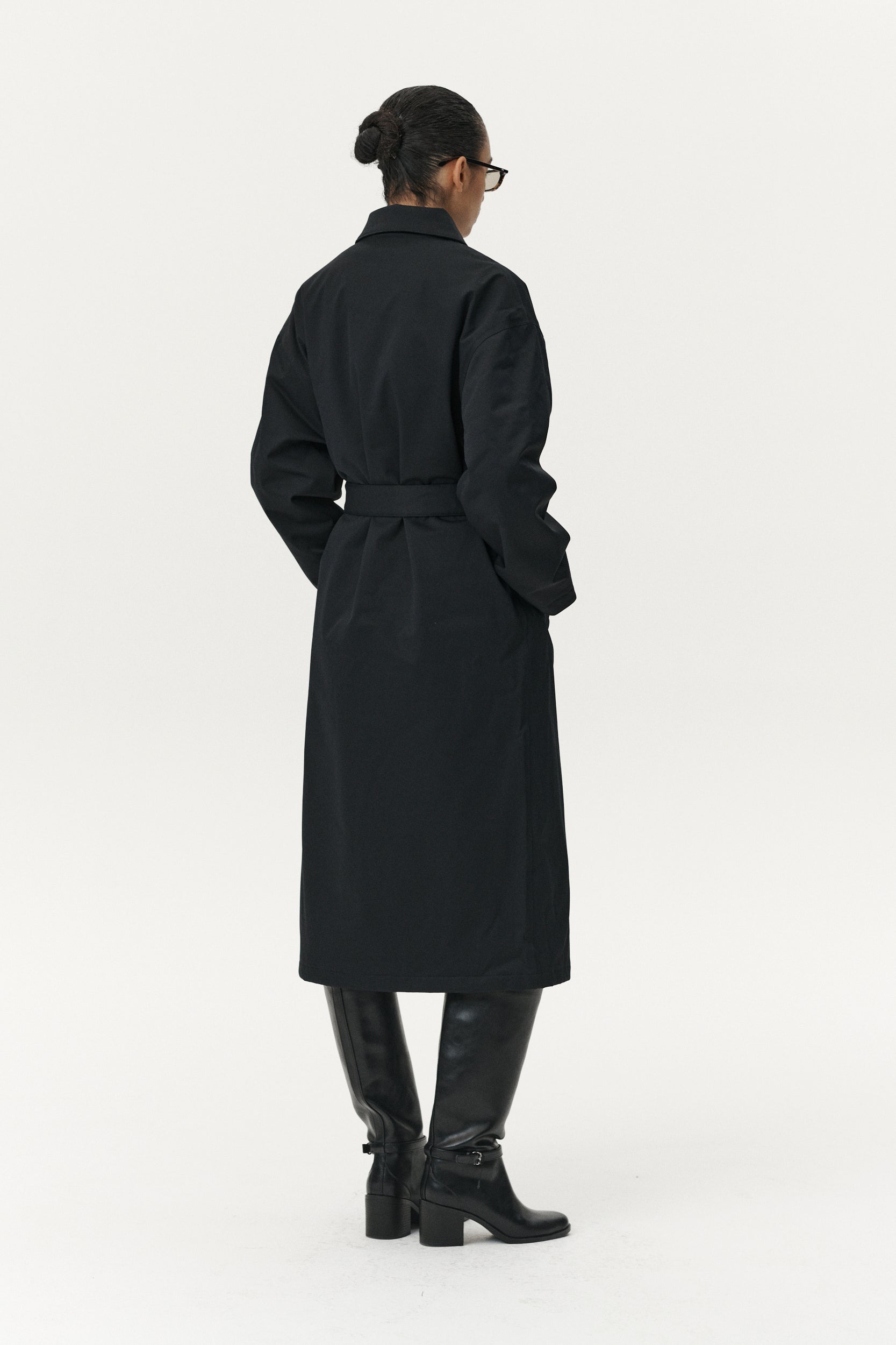 Een donkerblauwe ruime trenchcoat met verlaagde schouders. Het is een klassieke stijl met een rekbare keperstof van polyester. De jas is zeer licht en stijlvol, en kan gedragen worden met de ceintuur aan de voor- of achterkant.