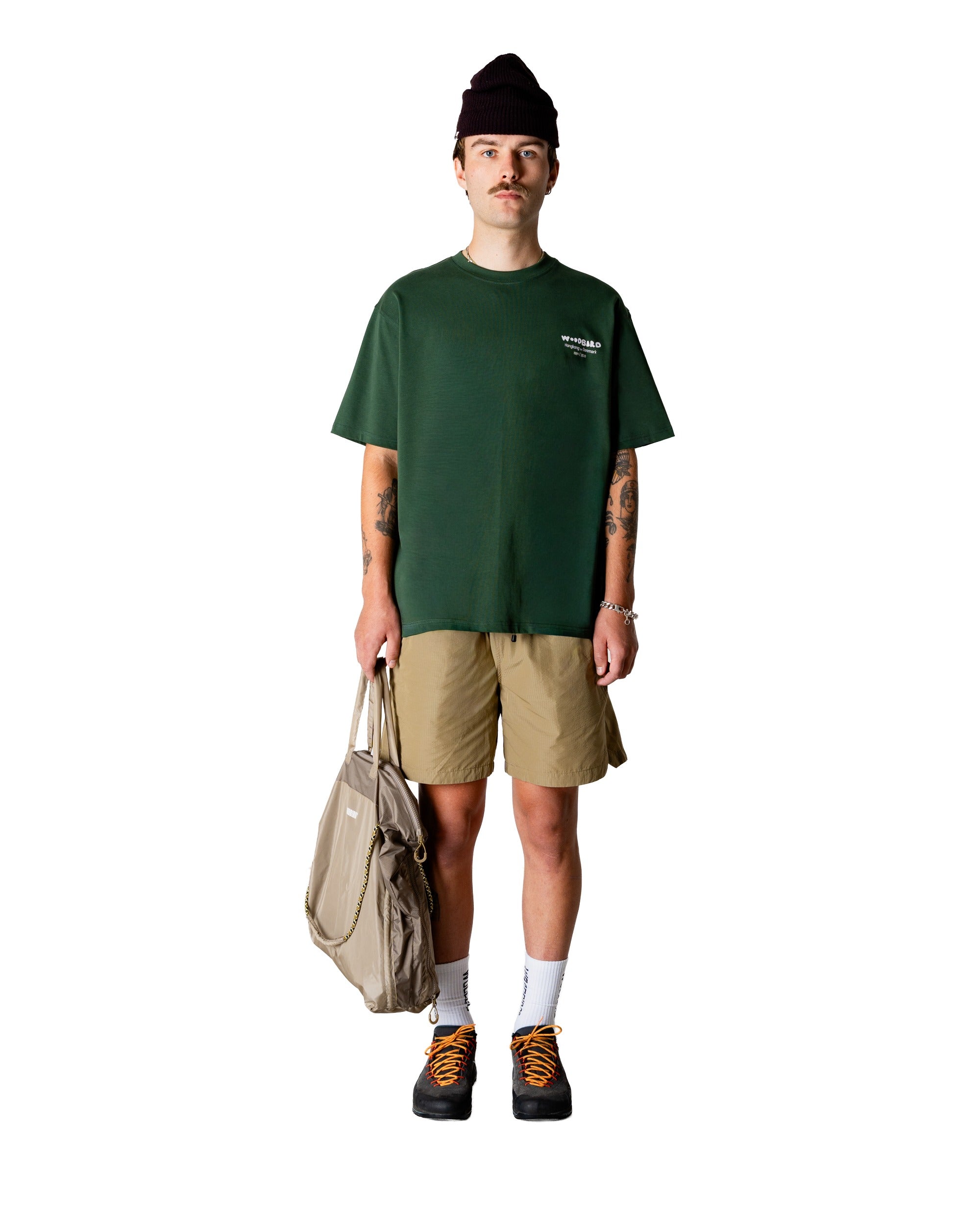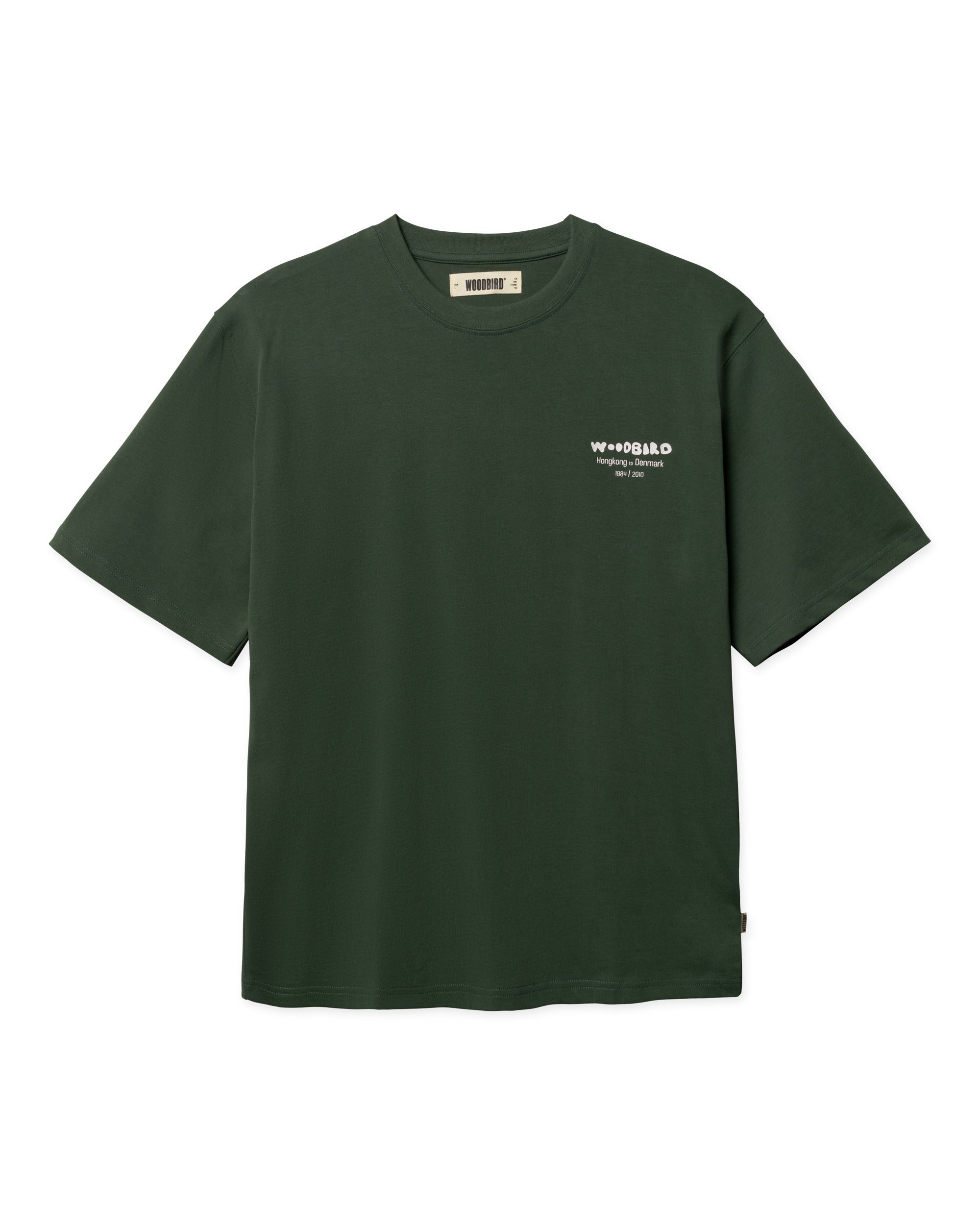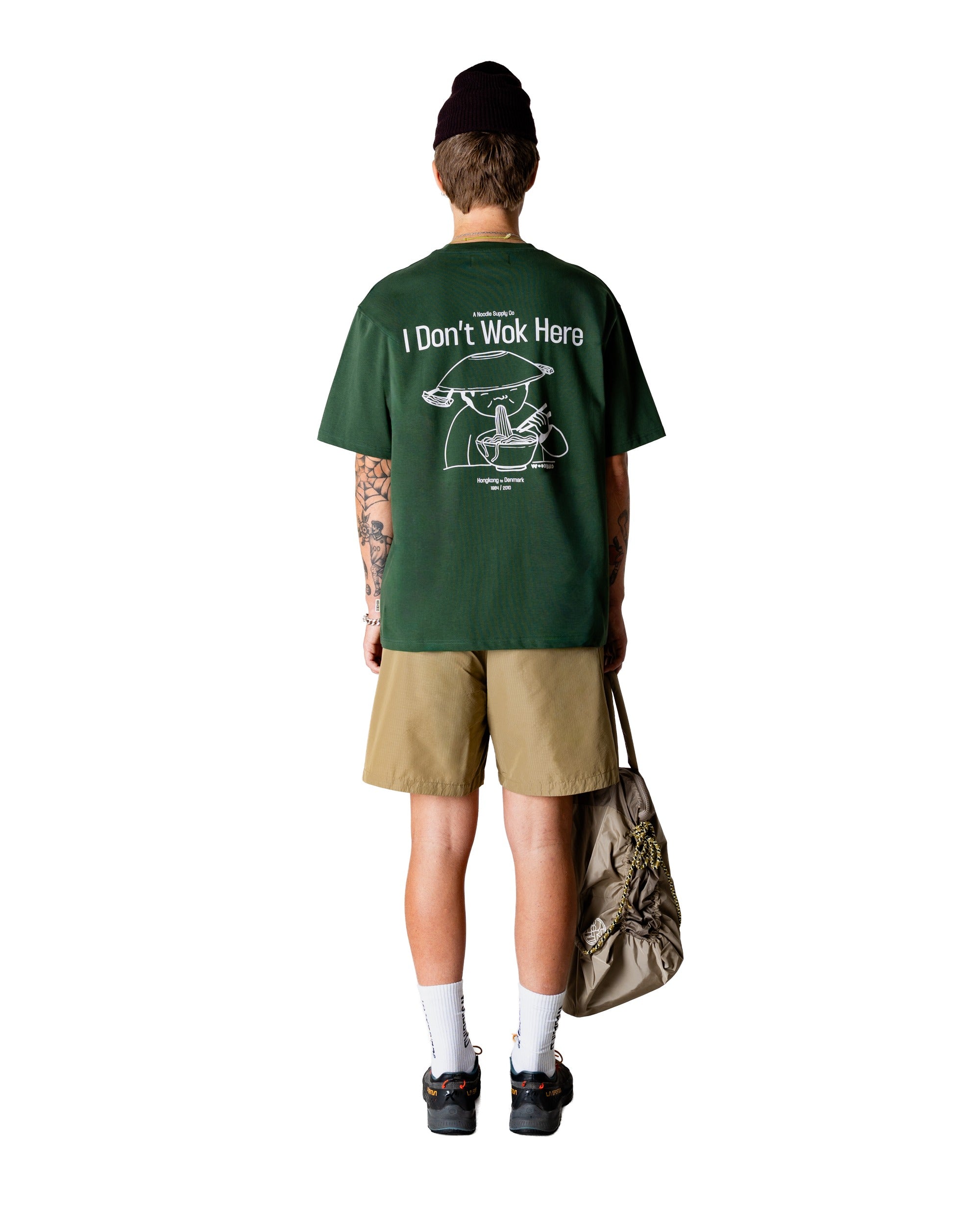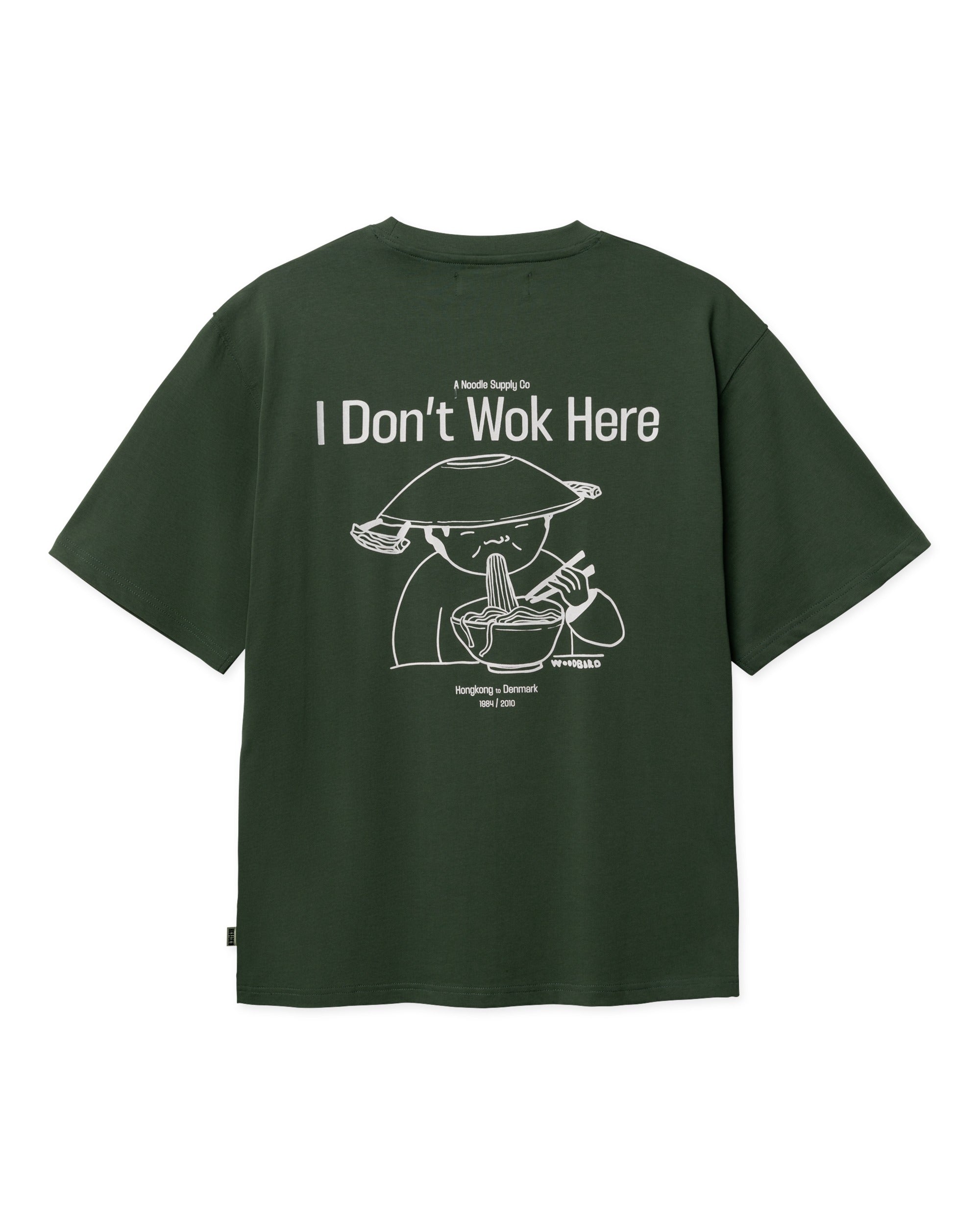 Een groen casual fit T-shirt met een ontspannen silhouet, ontworpen voor dagelijks draaggemak met een unieke twist. Dit shirt is gemaakt van zacht katoen en heeft een klassieke ronde halslijn. Terwijl de voorzijde minimalistisch is gehouden met een subtiel logo op de borst, steelt de achterkant de show met een grote grafische "Wok" print. De diepe, natuurlijke Pine Green tint geeft het shirt een stoere uitstraling die perfect past in een moderne streetwear garderobe.