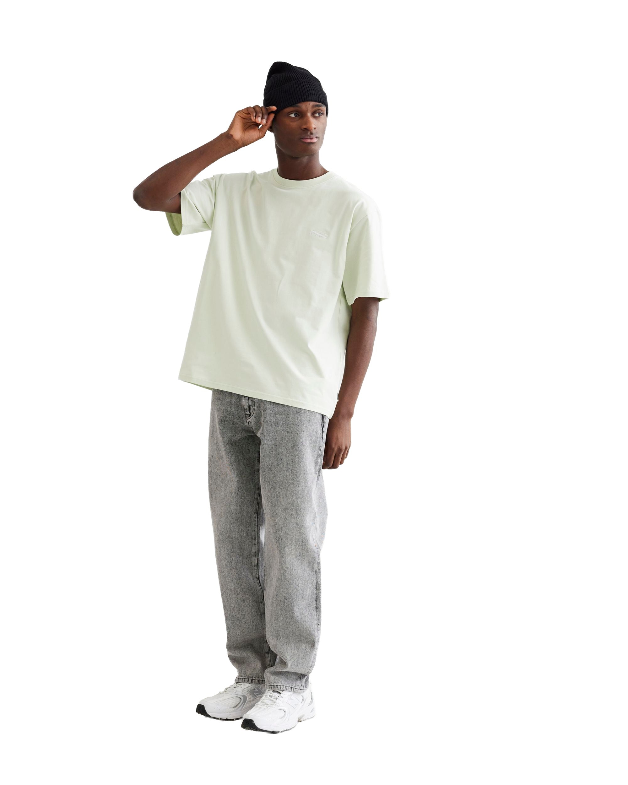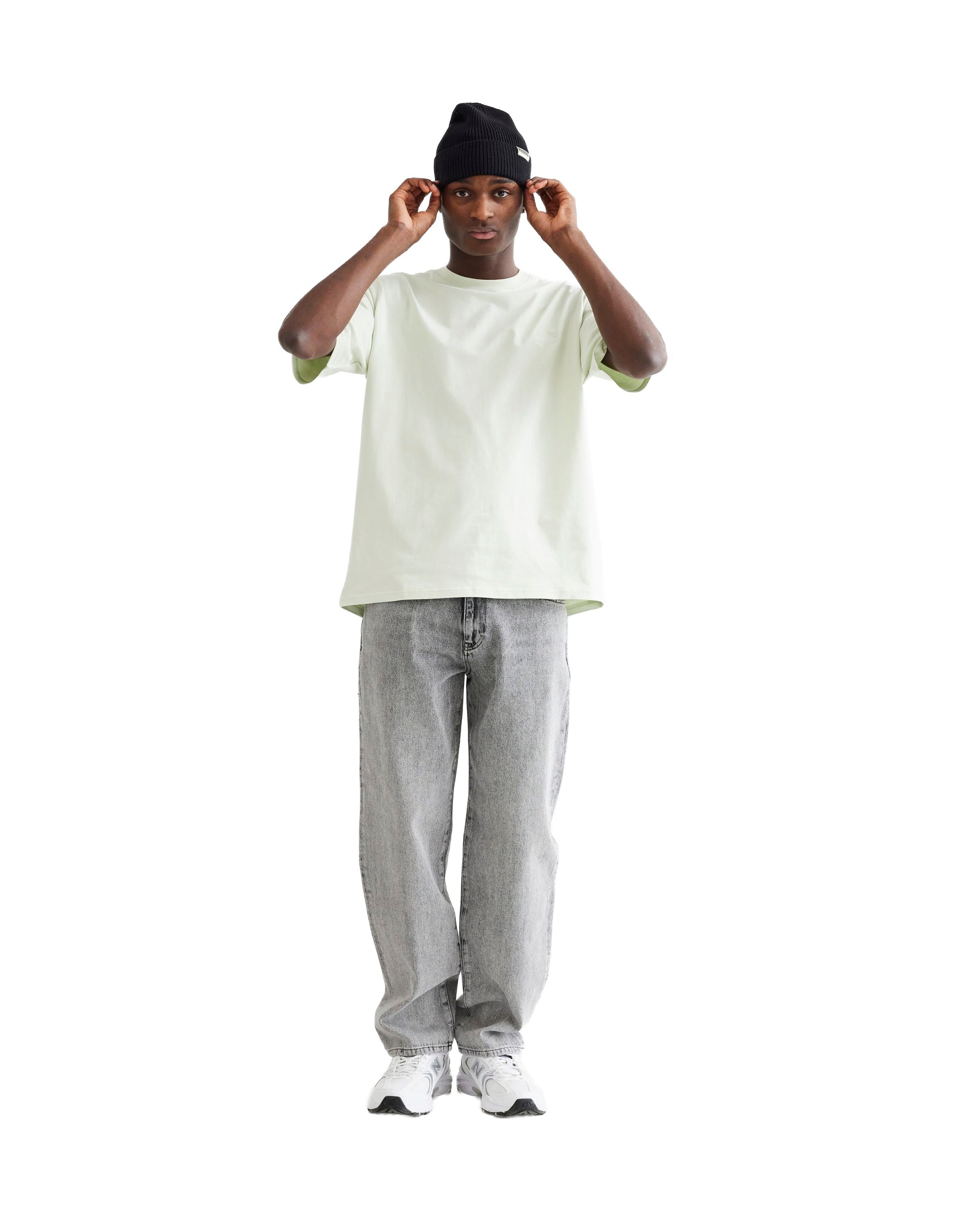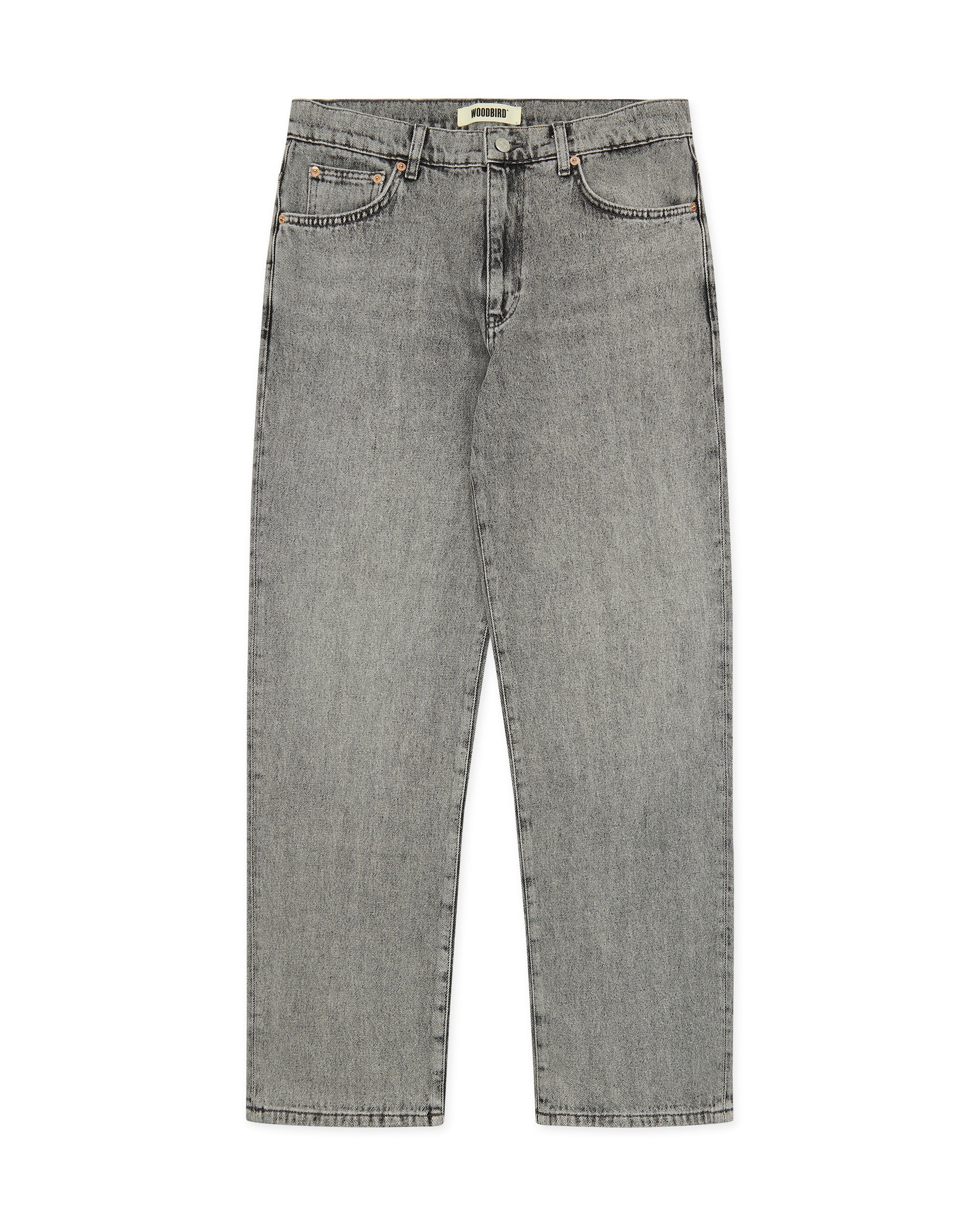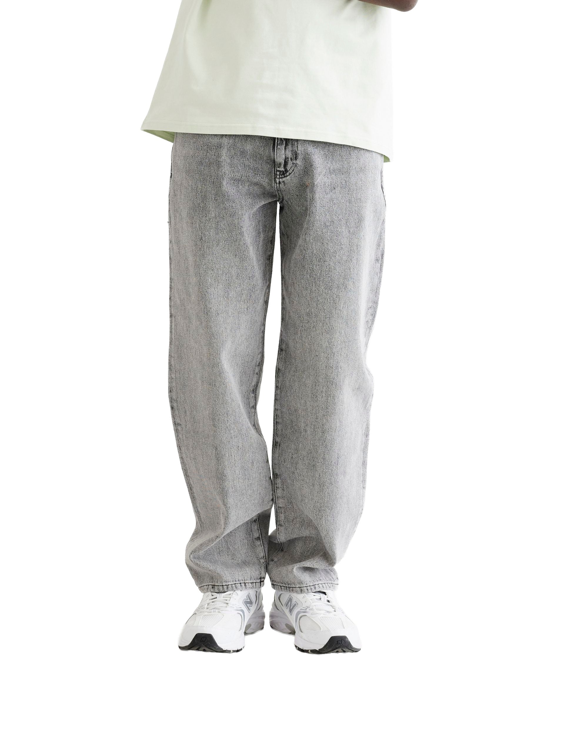 Een grijze eigentijdse spijkerbroek met een 'loose fit' en een 'tapered leg'. Deze jeans is gemaakt van een stevige, gestructureerde denim van 100% katoen, wat zorgt voor een authentieke look en een robuust gevoel. Het ontwerp heeft een klassieke five-pocket constructie en een strakke tailleband met riemlussen. Het silhouet is ongecompliceerd en stabiel: een pasvorm die simpelweg werkt voor een moderne, ontspannen uitstraling.
